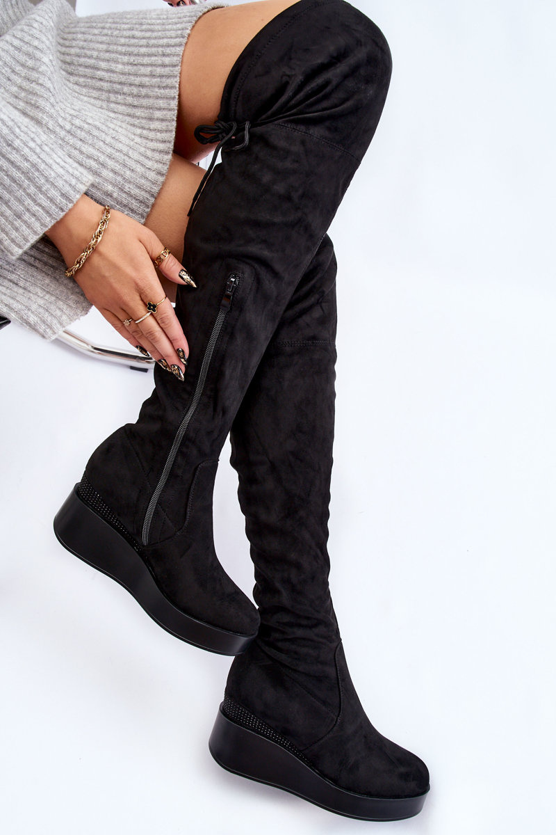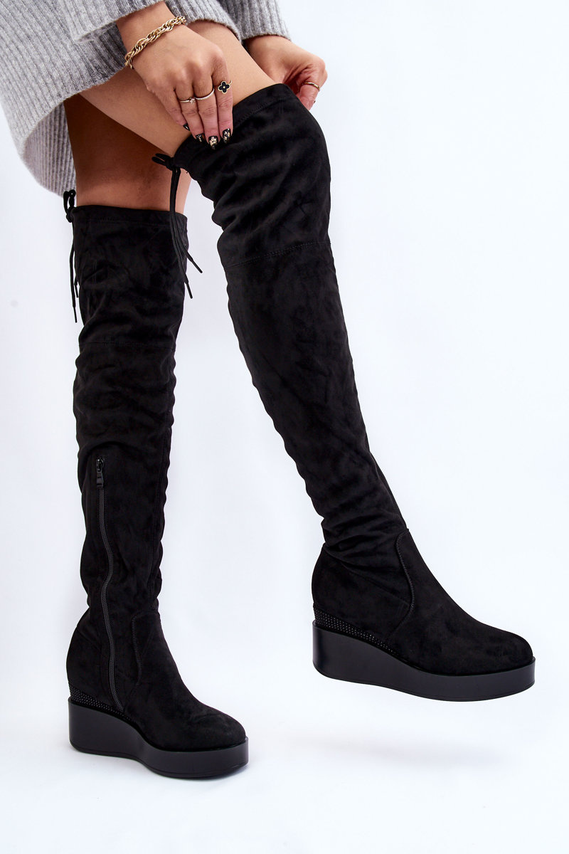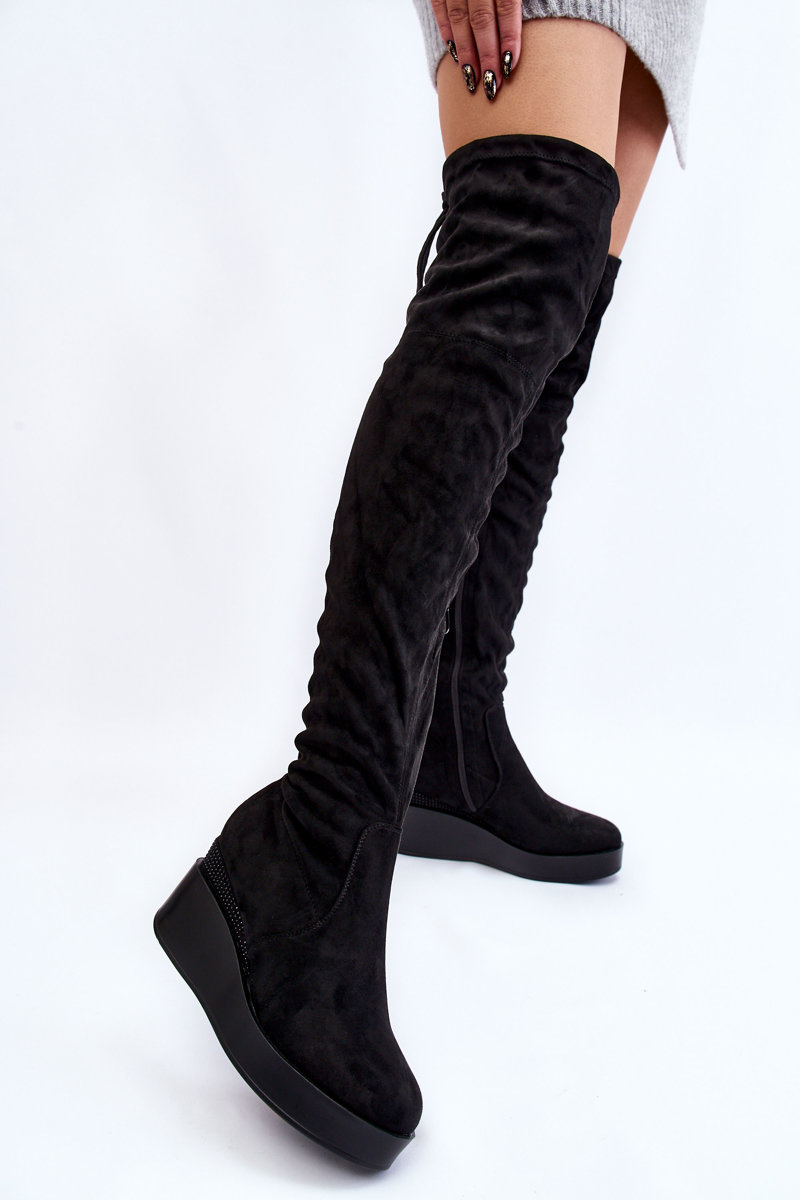 Чудові жіночі чоботи з тонуючої тканини. Модель сліп-он з додатковою застібкою-блискавкою збоку верху. Чоботи ставилися на танкетці і платформі. Крім того, їх прикрашали стразами. Каблук посилений. Модель за коліном, з зав'язкою вгорі. Черевики мають утеплювач на висоті стопи. Вибираючи розмір, орієнтуйтеся на таблицю розмірів.