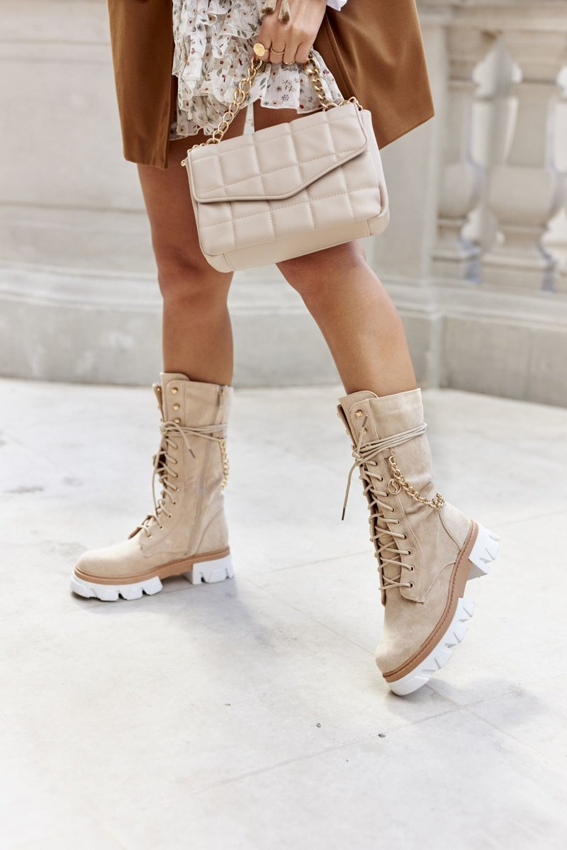 Чудові черевики, які можуть стати вашими! Високий верх, утеплений зсередини ковдрою для взуття гарантує комфорт навіть у найхолодніші дні. Застібка-блискавка збоку полегшує їх надягання, а міцна шнурівка забезпечує ідеальну посадку. Красива прикраса у вигляді золотого ланцюжка. Додатковим захистом є товста неслизька підошва. <Під час вибору розміру зверніться до таблиці розмірів.