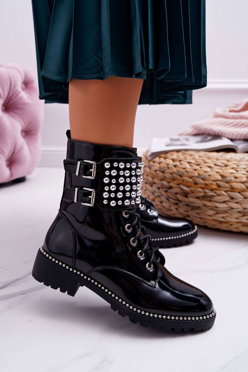 Жіночі військові лаковані черевики на плоскій підошві чорні Bemmer