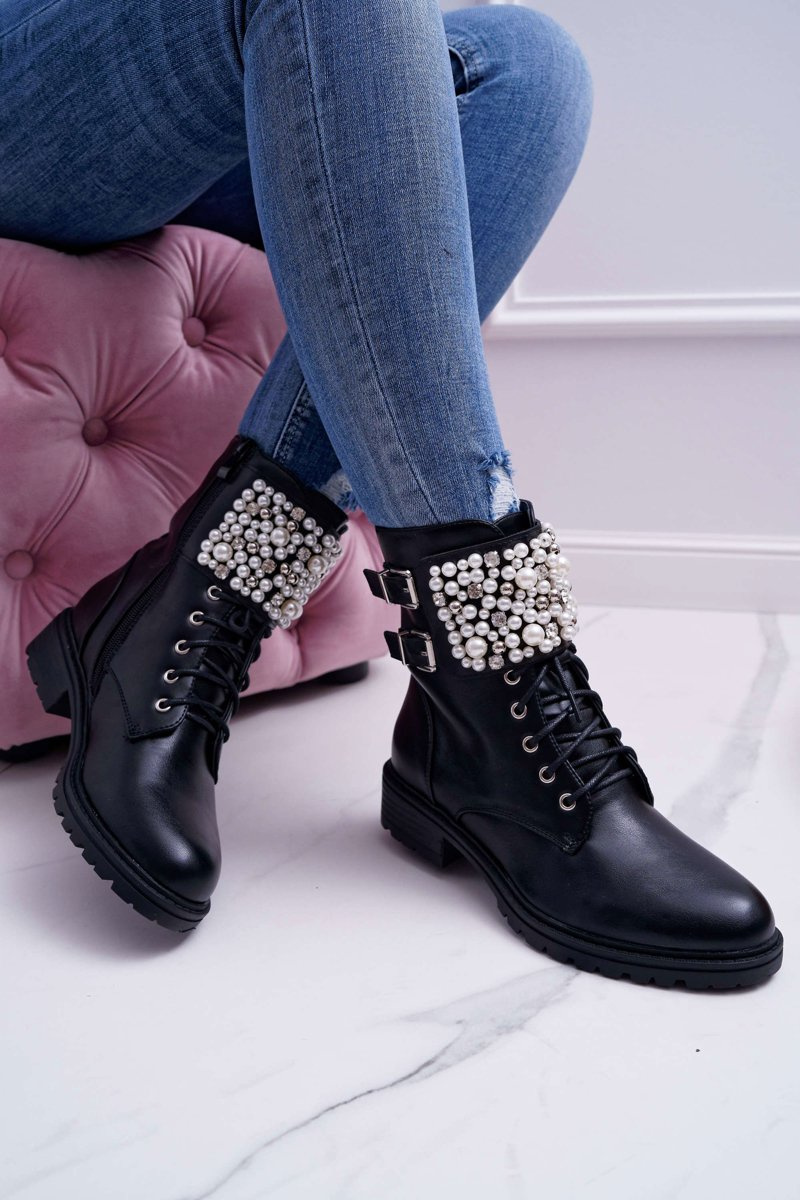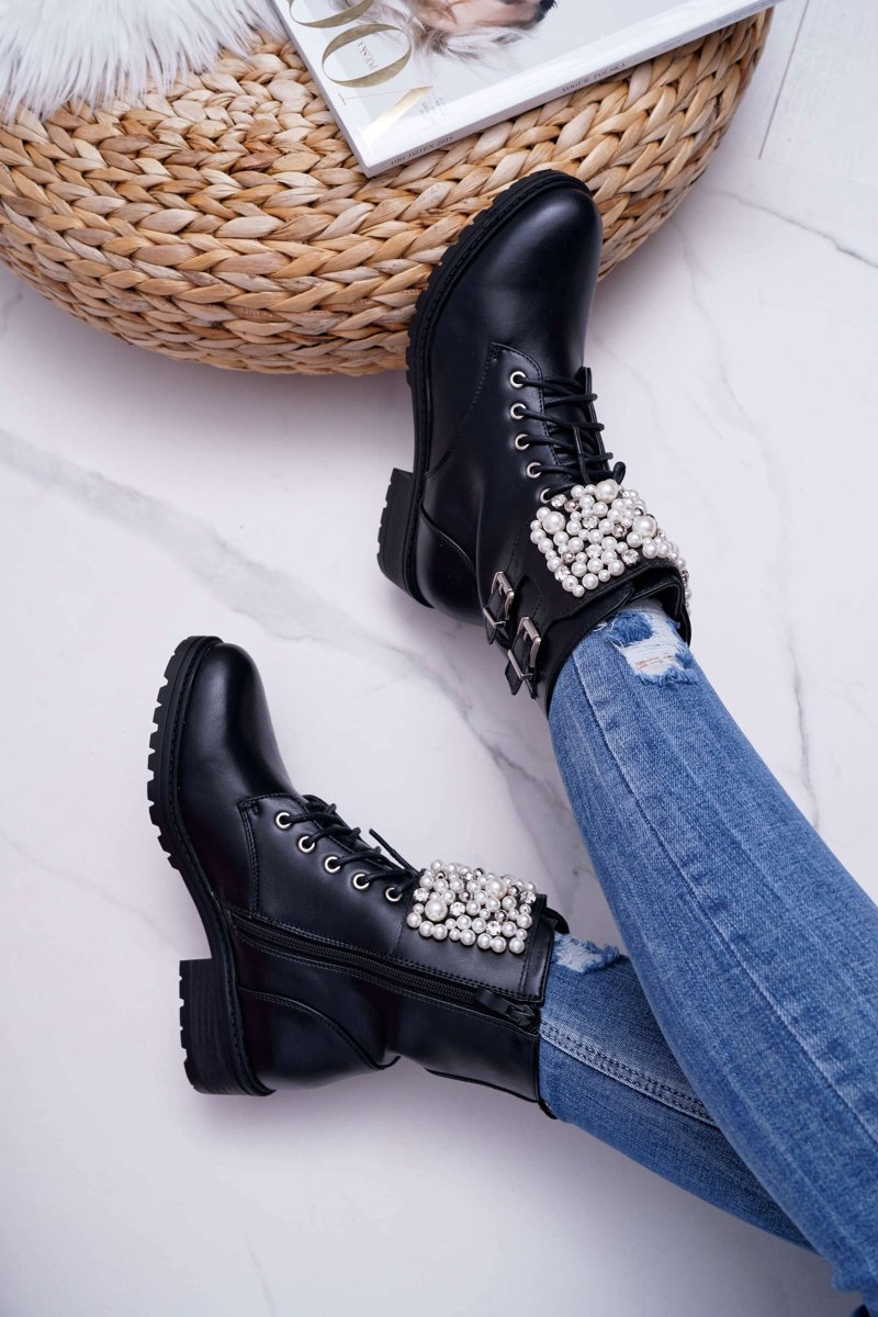 Якщо ви прийшли сюди, це означає, що ви шукаєте модне та зручне взуття для холодних днів. Високий верх застібається збоку з красивим декором у вигляді перлин і цирконів. Можливість кращої посадки завдяки використанню шнурків, які, завдяки тому, що ховаються під клапаном з перлами, також створюють чудову прикрасу. Середина покрита приємною на дотик ковдрою для взуття. Ми любимо давати жінкам привід купити нову пару взуття, і ці черевики – лише один із них! Під час вибору розміру запропонуйте таблицю розмірів, яка доступна після наведення вказівника або натискання на розмір.