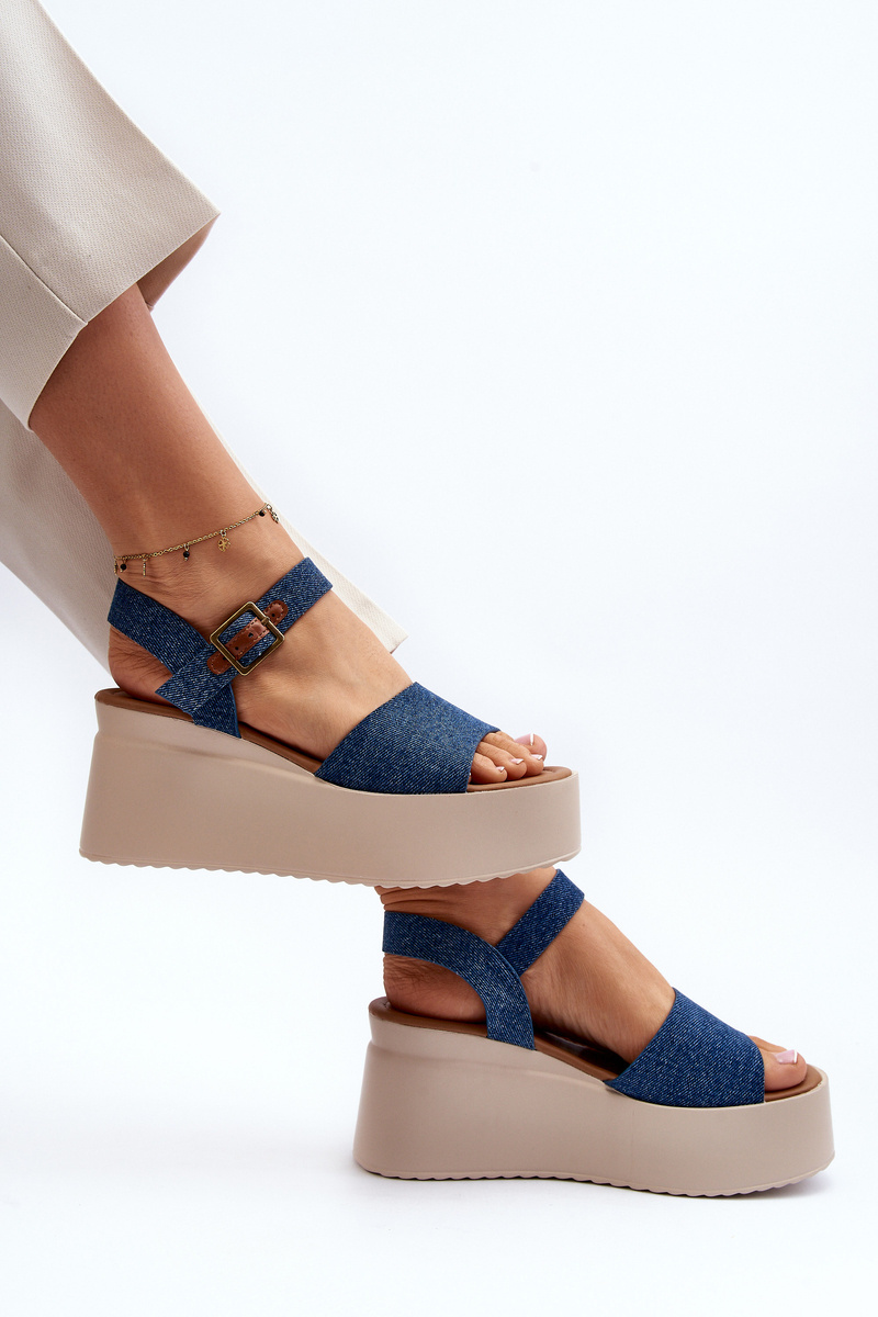 Жіночі джинсові босоніжки на танкетці синього кольору Geferia