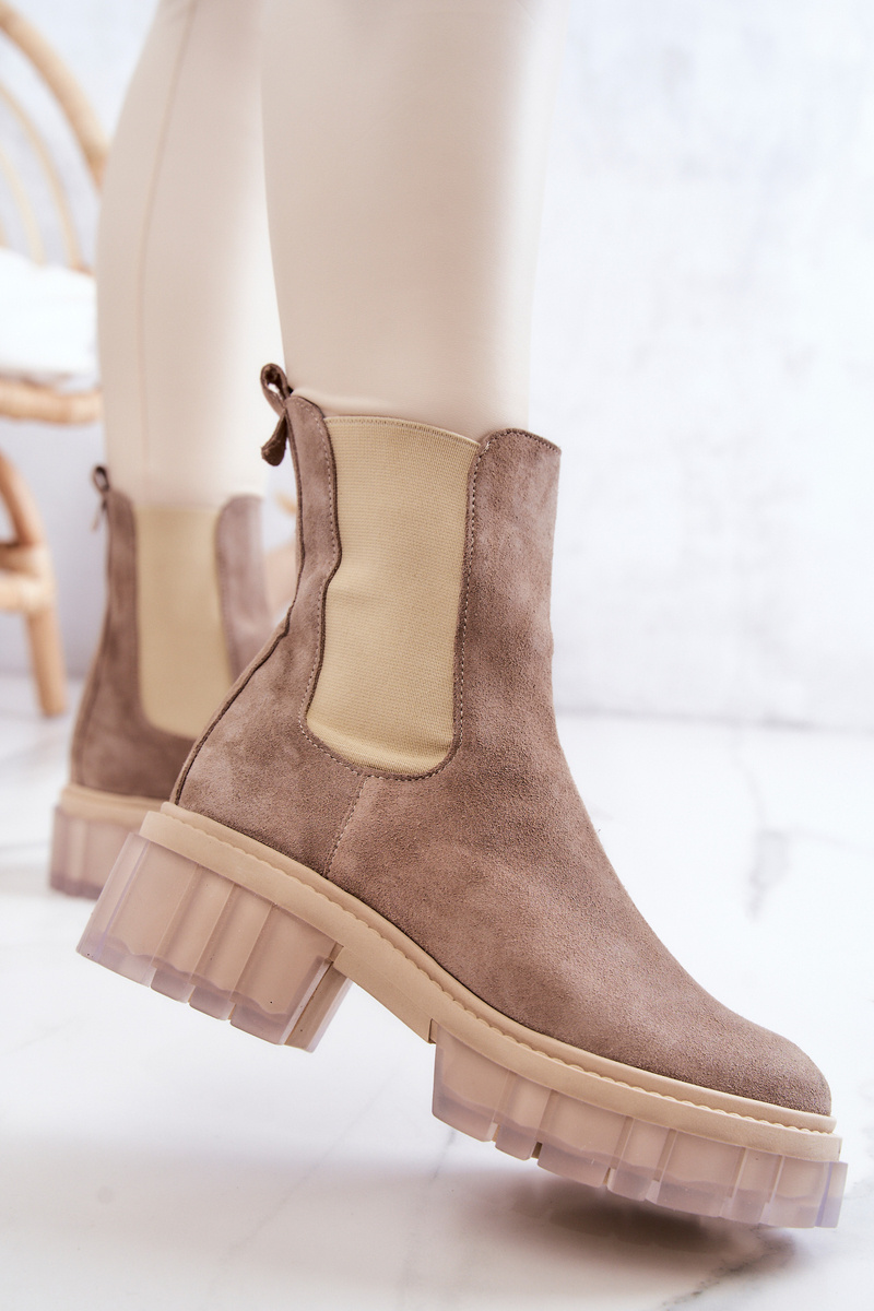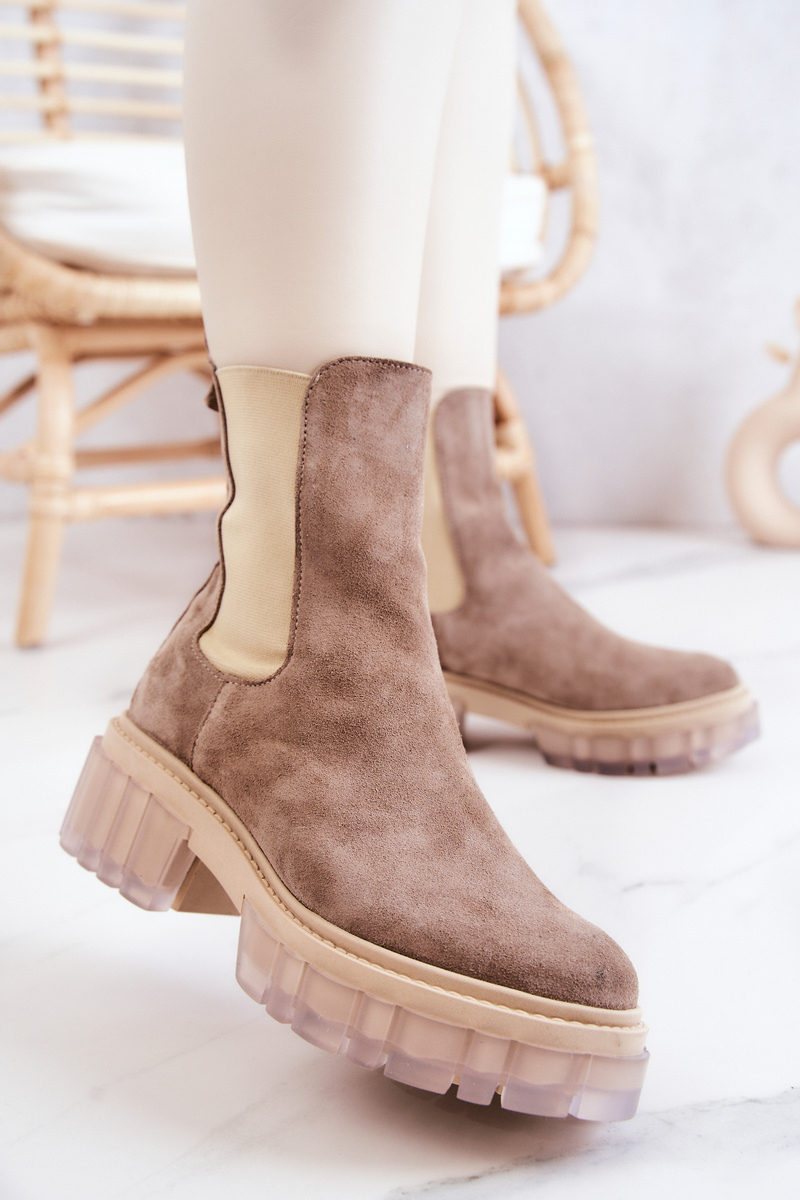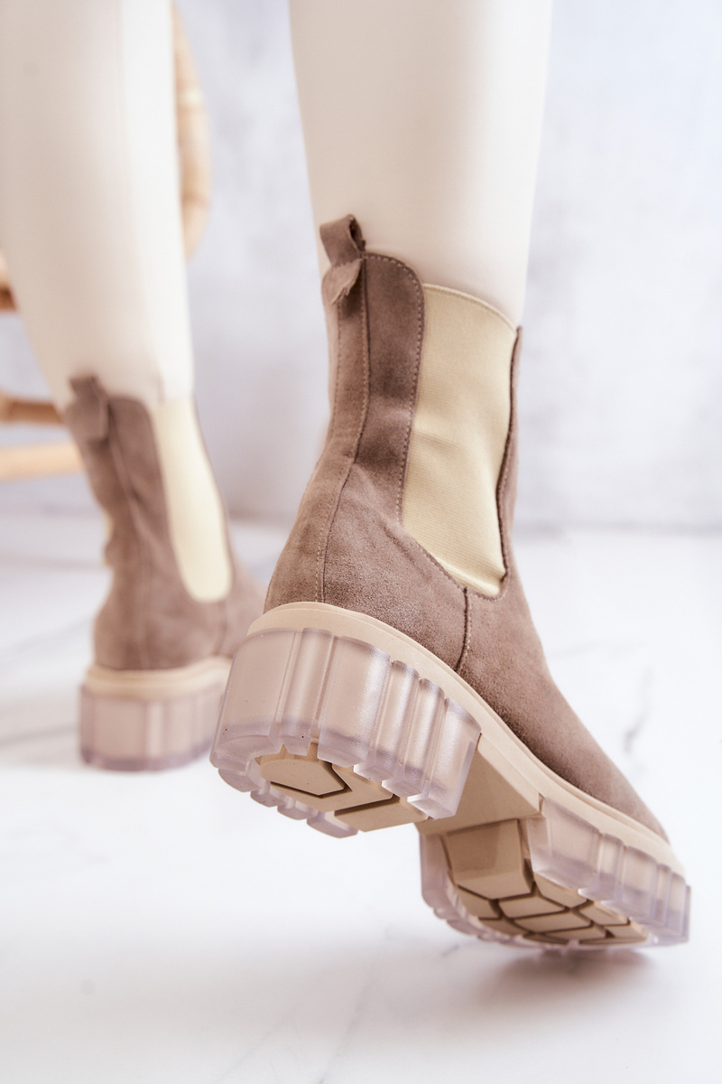 Черевики на масивній платформі з широким каблуком в стилі чобіт челсі. Вони мають високий верх, що досягає вище щиколотки. Виготовлений з натуральної замші. Мають додаткову гнучку вставку, завдяки якій верх буде ідеально відповідати ширині ноги. Боковини підошви оздоблені прозорим, гумовим матеріалом. При виборі розміру скористайтеся таблицею розмірів