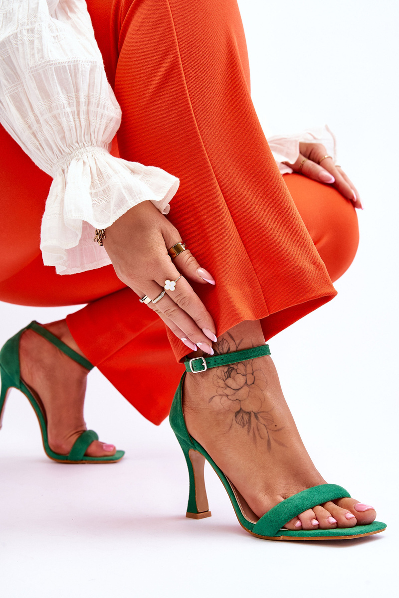 Красиві жіночі босоніжки з приємної на дотик еко замші. Ремінець спереду та п’ятка посилені. Модель з регульованим ремінцем, що застібається на пряжку. М'яка устілка з екошкіри забезпечить комфорт під час використання взуття. Босоніжки встановлювалися на каблук у вигляді шпильки. Чудова модель для сукні або елегантних брюк. Обираючи розмір, орієнтуйтеся на таблицю розмірів.