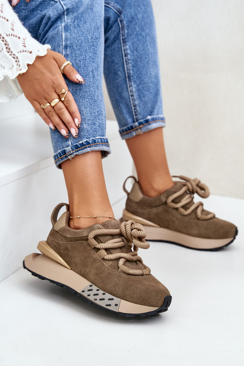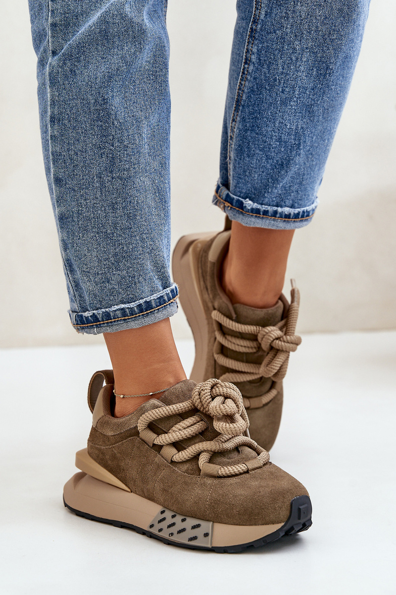 Жіночі кросівки з натуральної замші. Встановити на платформу. Ця модель має товсту шнурівку. Платформа забезпечує додатковий комфорт і легкість під час ходьби, а також додає кілька сантиметрів висоти. Ідеально підходить як для повсякденного образу, так і для більш повсякденних ансамблів. Виберіть їх, щоб підкреслити свій унікальний стиль і насолоджуватися комфортом протягом усього дня. Обираючи розмір, орієнтуйтеся на таблицю розмірів.