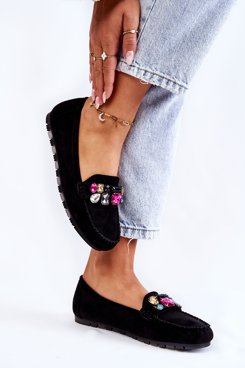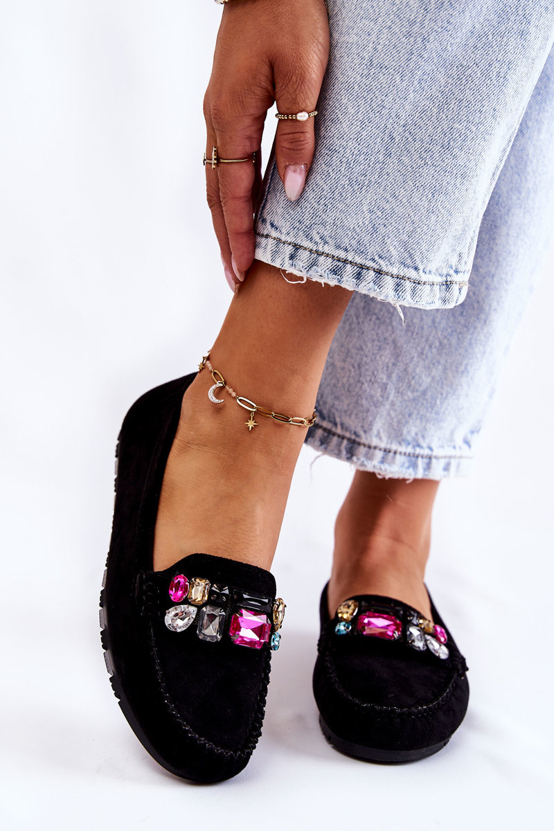Жіночі мокасини виготовлені з приємної на дотик еко замші. Спереду є декоративні камені. Мокасини кріпляться на ніжній платформі з неслизькою підошвою. Каблук злегка посилений. М'яка устілка додатково перфорована з натуральної шкіри. Чудова модель для багатьох стилів! При виборі розміру скористайтеся таблицею розмірів.