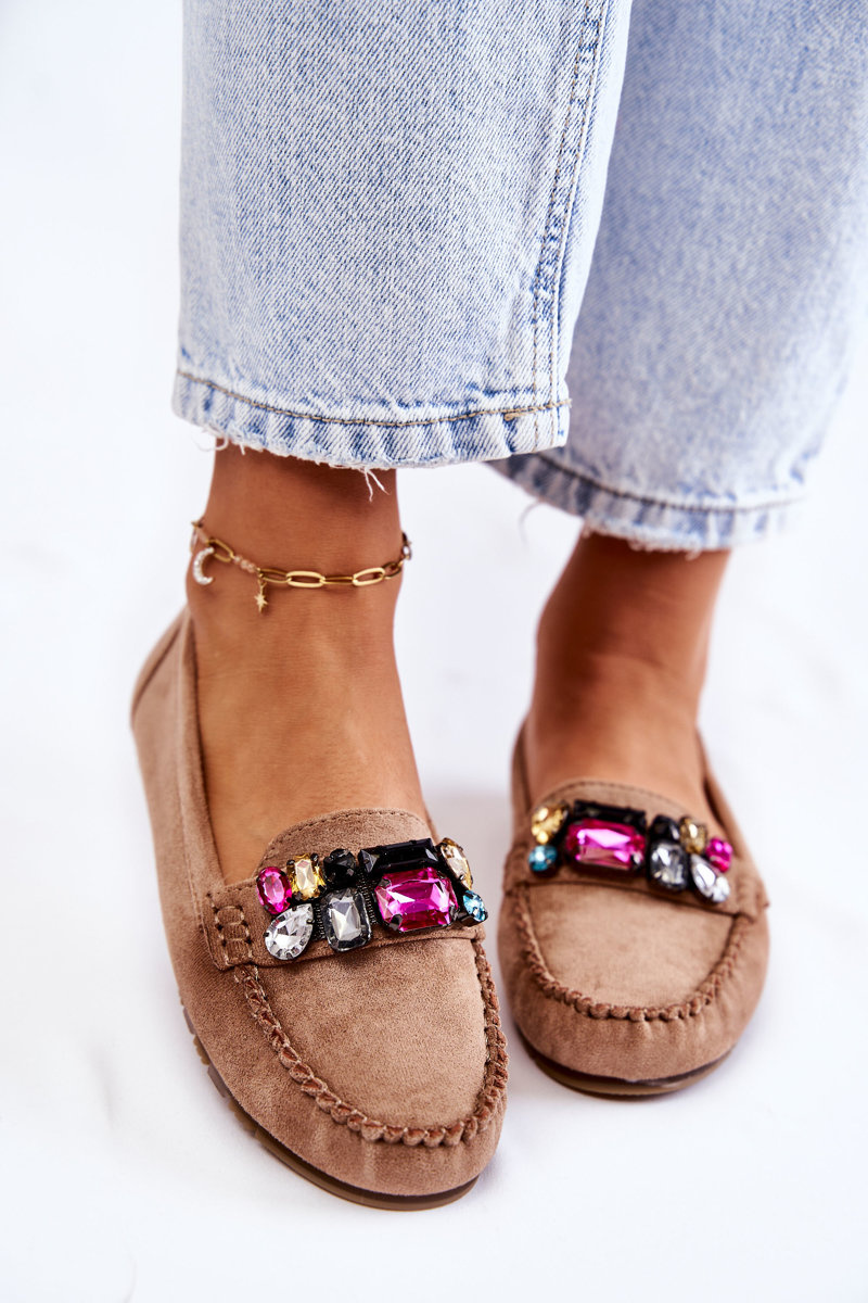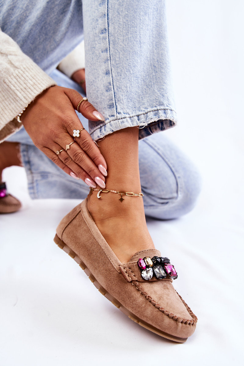 Жіночі мокасини виготовлені з приємної на дотик еко замші. Спереду є декоративні камені. Мокасини кріпляться на ніжній платформі з неслизькою підошвою. Каблук злегка посилений. М'яка устілка додатково перфорована з натуральної шкіри. Чудова модель для багатьох стилів! При виборі розміру скористайтеся таблицею розмірів.