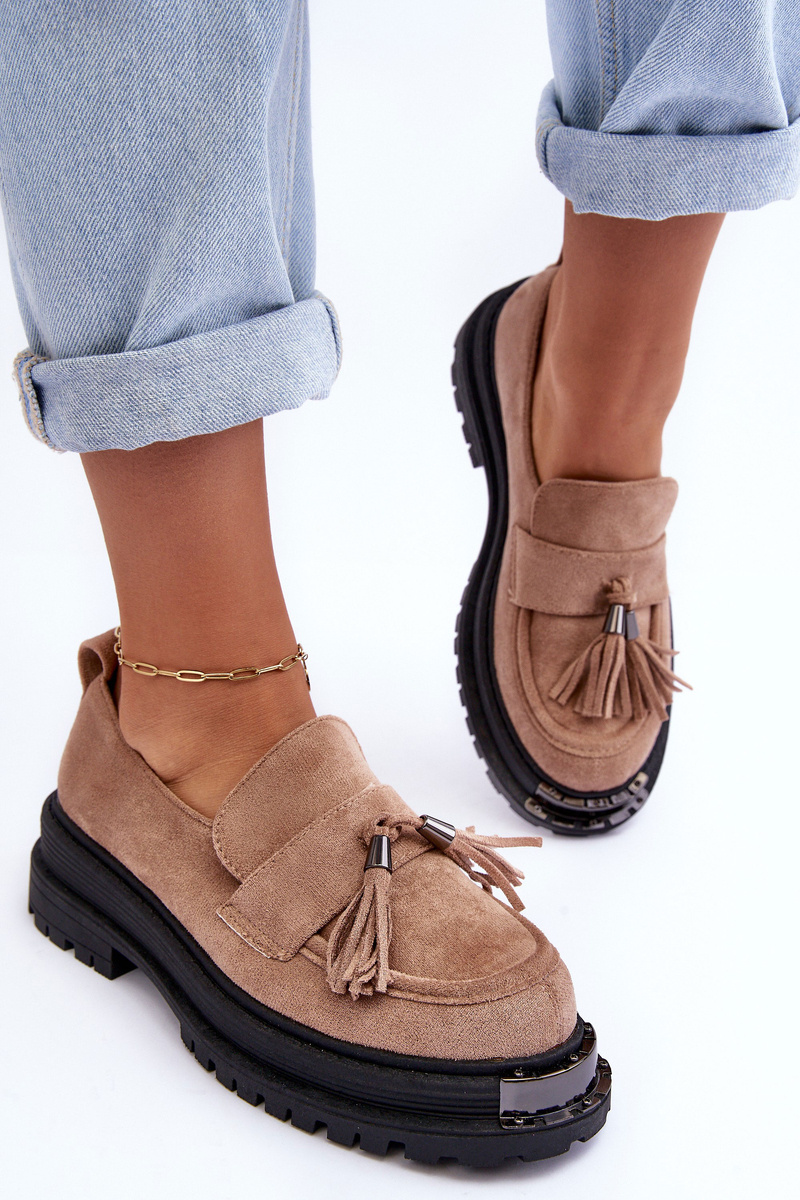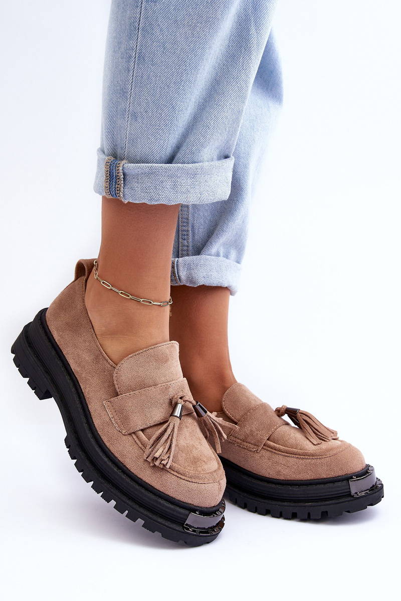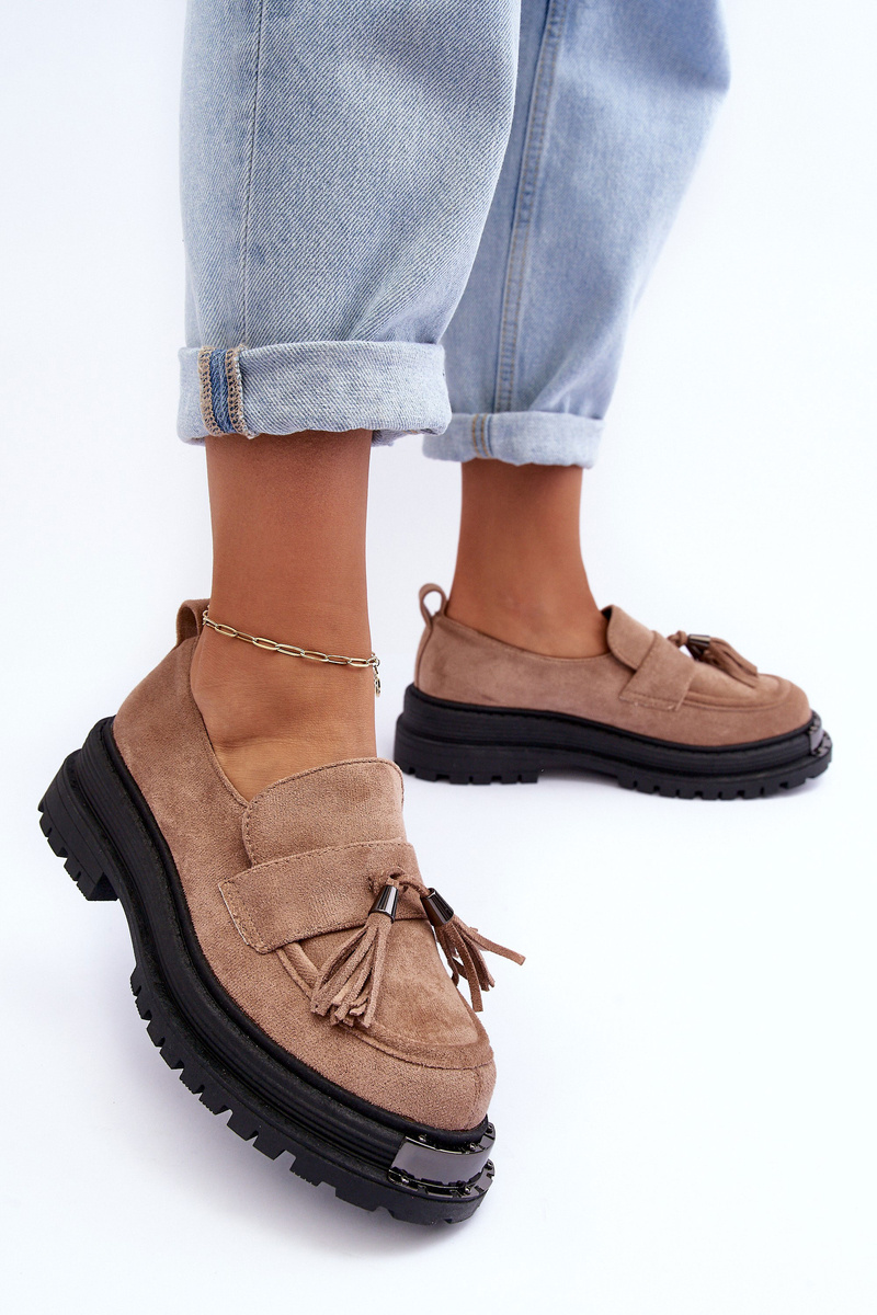Жіночі мокасини — ідеальне взуття для багатьох випадків! Виготовлена ​​з еко замші. Комплект на плоскій каблуці і платформі. Круглі пальці. Спереду прикрашена ремінцем з бахромою. М'яка устілка з екошкіри забезпечить комфорт під час використання. Крім того, стійка посилена. Ця модель вам точно сподобається! При виборі розміру орієнтуйтеся на таблицю розмірів.
