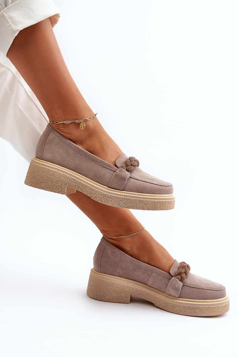 Чарівні жіночі мокасини з натуральної замші. Вони мають плоску п'яту з ніжною платформою, що забезпечує стійкість і комфорт під час носіння. Закруглені пальці додають їм тонкого шарму. Профільована устілка гарантує комфорт під час використання. Додаткової елегантності надають невеликі циркони, розміщені на ремінці спереду. Вони обов'язково повинні бути у вашому весняному гардеробі! Обираючи розмір, орієнтуйтеся на таблицю розмірів.