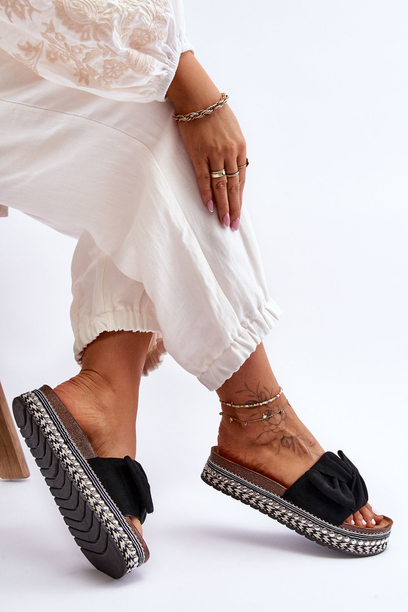 Класичні жіночі шльопанці встановлені на масивній платформі з прикрасами у вигляді зав'язок і шпильок. Виготовлена з еко замші. Спереду прикраса у вигляді банта. Профільована устілка виконана з приємної на дотик еко замші. Ці шльопанці - ідеальна модель для літа! Обираючи розмір, орієнтуйтеся на таблицю розмірів.