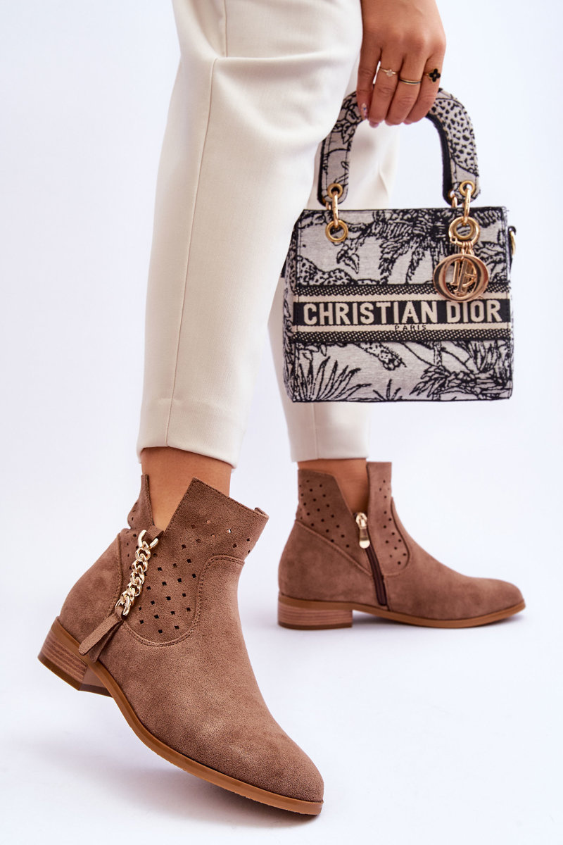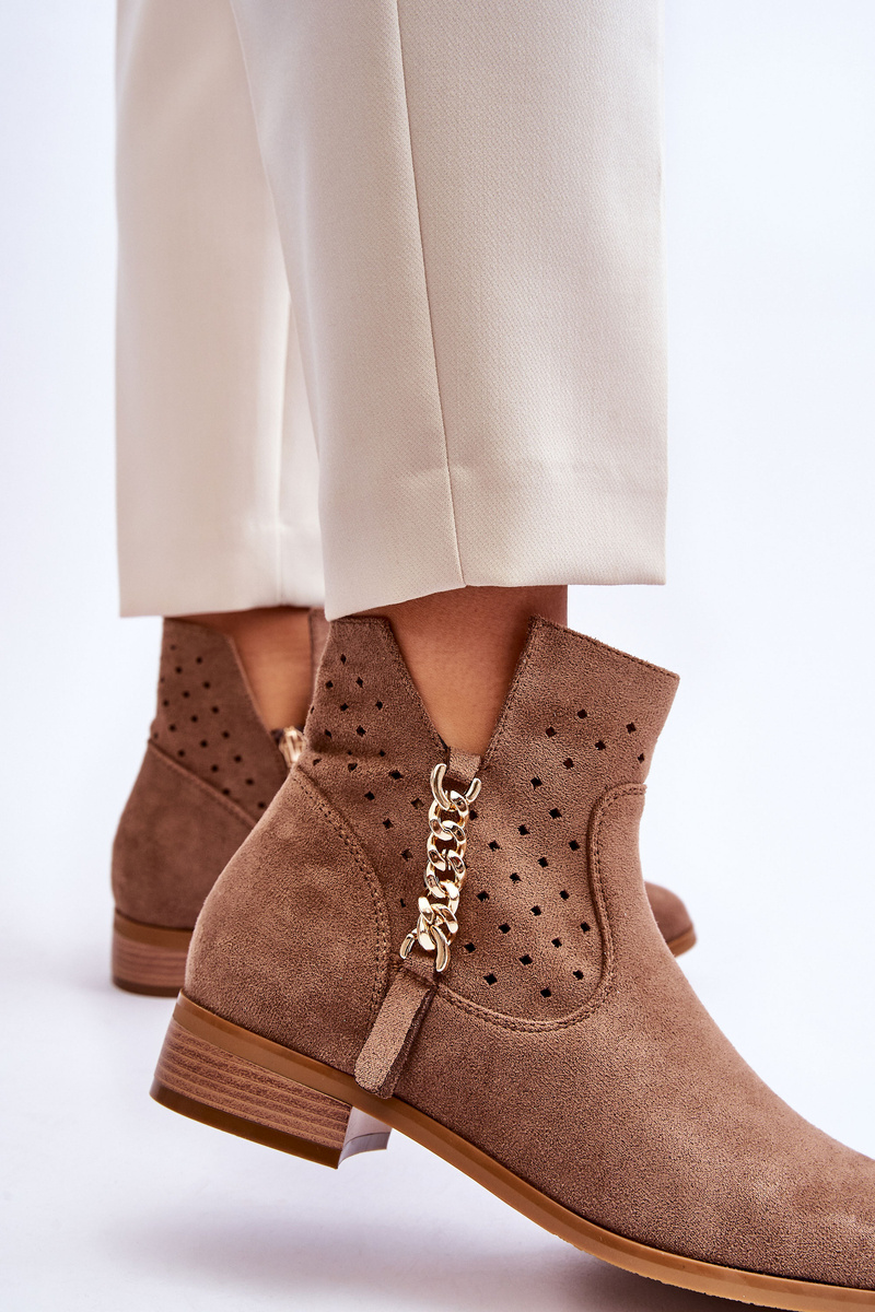 Черевики виготовлені з еко замші. Зверху мають ажурний декор і декоративний ланцюжок. Всередині взуття устілка з еко шкіри. Надягання полегшить вшита збоку блискавка. Плоский каблук забезпечить стабільність на кожному кроці. Дана модель додатково має посилений каблук. Носок у формі ніжного мигдалю оптично витончує стопу. Обираючи розмір, орієнтуйтеся на таблицю розмірів.