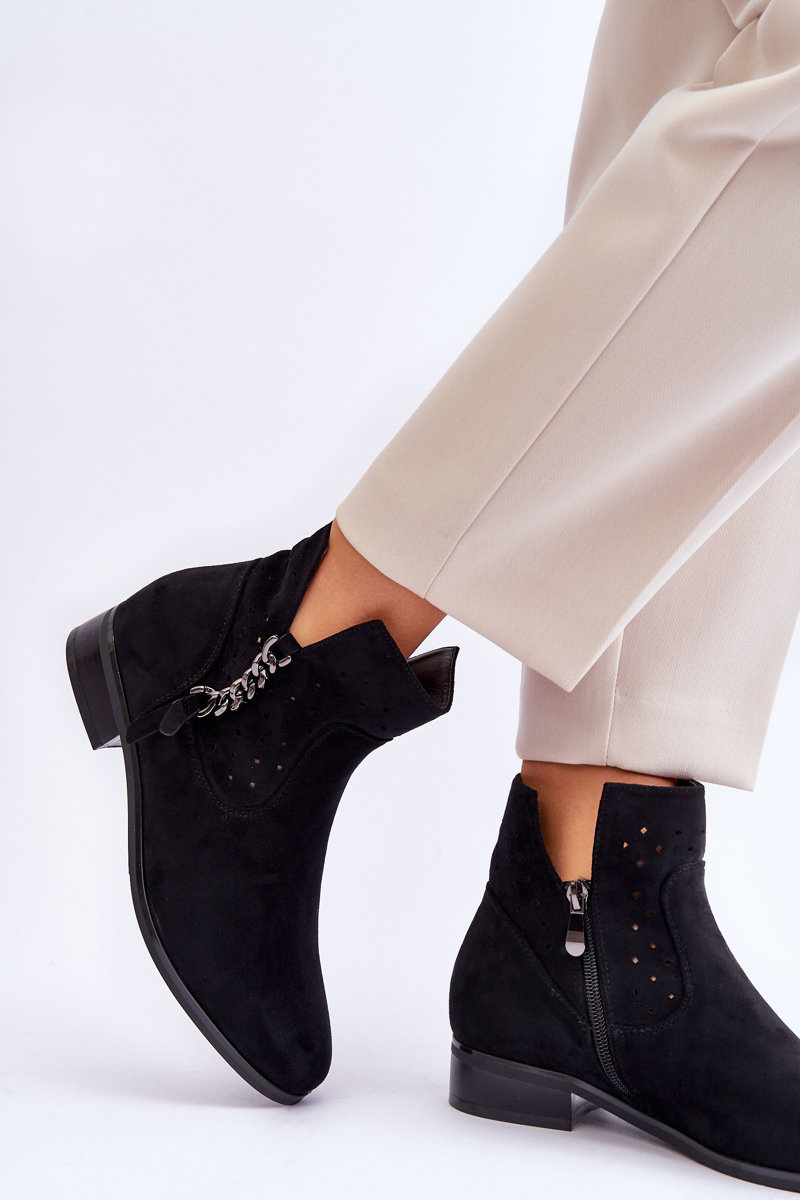 Черевики виготовлені з еко замші. Зверху мають ажурний декор і декоративний ланцюжок. Всередині взуття устілка з еко шкіри. Надягання полегшить вшита збоку блискавка. Плоский каблук забезпечить стабільність на кожному кроці. Дана модель додатково має посилений каблук. Носок у формі ніжного мигдалю оптично витончує стопу. Обираючи розмір, орієнтуйтеся на таблицю розмірів.