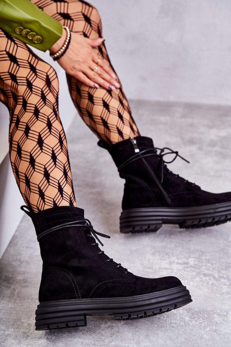 Черевики класичні з щиколоткою виготовлені з високоякісної екошкіри. Модель має застібку-блискавку збоку верху та класичну шнурівку спереду. Крім того, вони мають посилений каблук. Вони кріпляться на ніжній платформі і плоскій каблуці. Вони не мають утеплювача. Ця модель ідеально підійде до багатьох стилів! При виборі розміру скористайтеся таблицею розмірів.