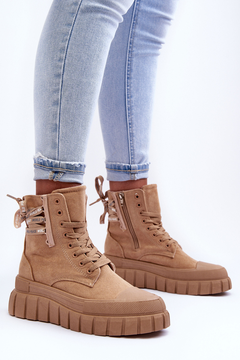 Жіночі модні черевики встановлені на масивній платформі з гумового матеріалу. Виготовлена ​​з еко замші. Дана модель застібається на блискавку збоку верху і додатково зашнуровується. Кінчик закруглений. Тканинна устілка забезпечить комфорт і зручність. Ви повинні мати їх у своєму гардеробі. При виборі розміру орієнтуйтеся на таблицю розмірів.