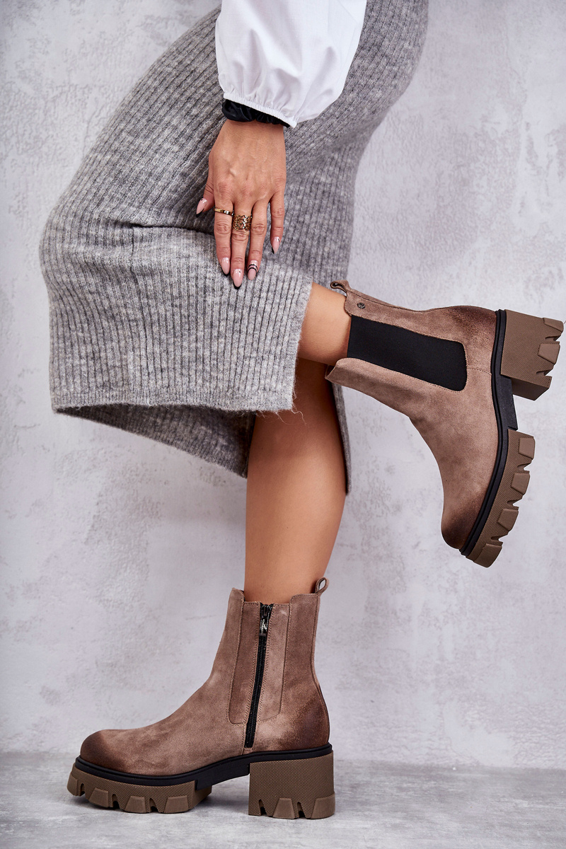 Черевики на масивній платформі з широким каблуком в стилі чобіт челсі. Вони мають високий верх, що досягає вище щиколотки. Виготовлений з натуральної шкіри. Мають додаткову гнучку вставку, завдяки якій верх буде ідеально відповідати ширині ноги. Взуття утеплено взуттєвою ковдрою. Чоботи ідеально підходять для осінніх стилізацій. При виборі розміру скористайтеся таблицею розмірів