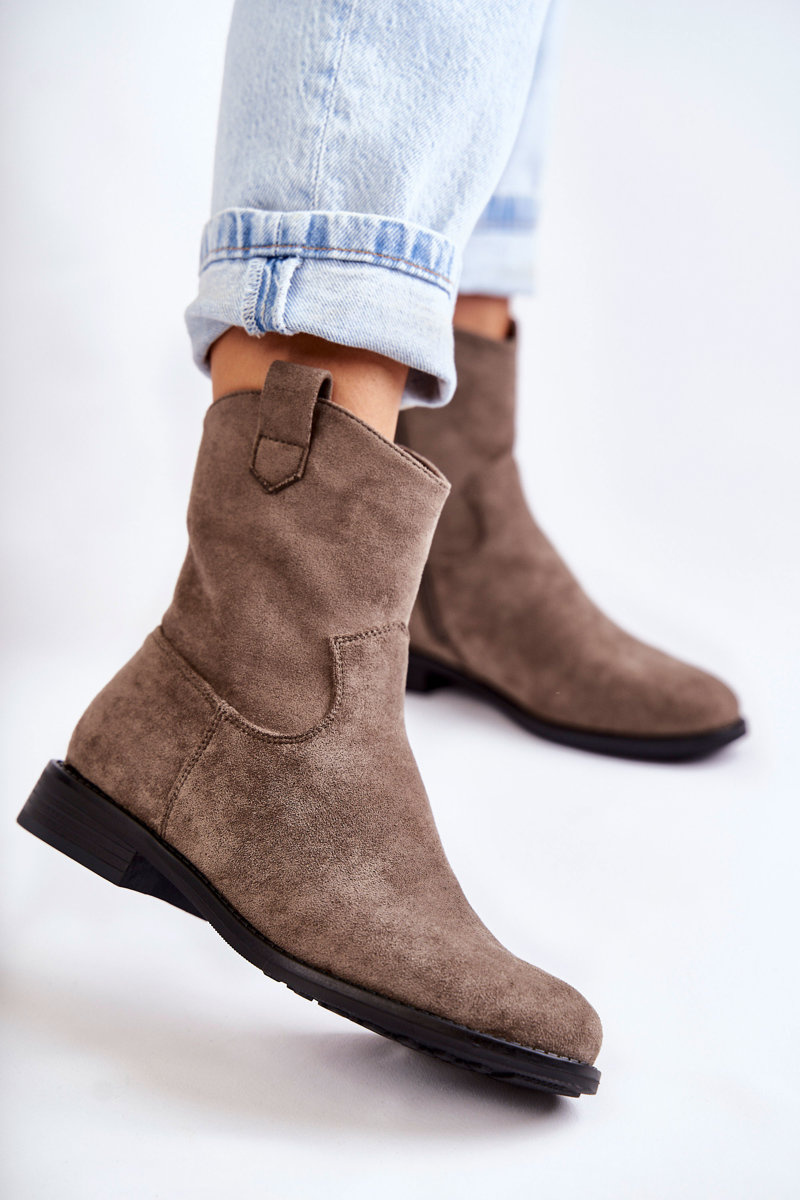 Класичні жіночі чоботи виготовлені з приємної на дотик еко замші. Верх має делікатну прострочку. Ця модель має петельку, яка полегшує взування взуття із зовнішнього боку. Черевики також мають блискавку. Комплект на плоскій каблуці. Мають посилений каблук і вставку з еко шкіри. При виборі розміру скористайтеся таблицею розмірів.