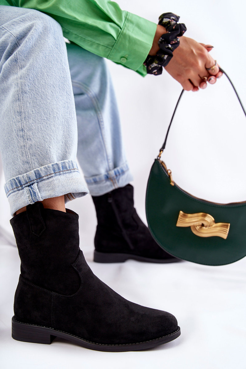 Класичні жіночі чоботи виготовлені з приємної на дотик еко замші. Верх має делікатну прострочку. Ця модель має петельку, яка полегшує взування взуття із зовнішнього боку. Черевики також мають блискавку. Комплект на плоскій каблуці. Мають посилений каблук і вставку з еко шкіри. При виборі розміру скористайтеся таблицею розмірів.
