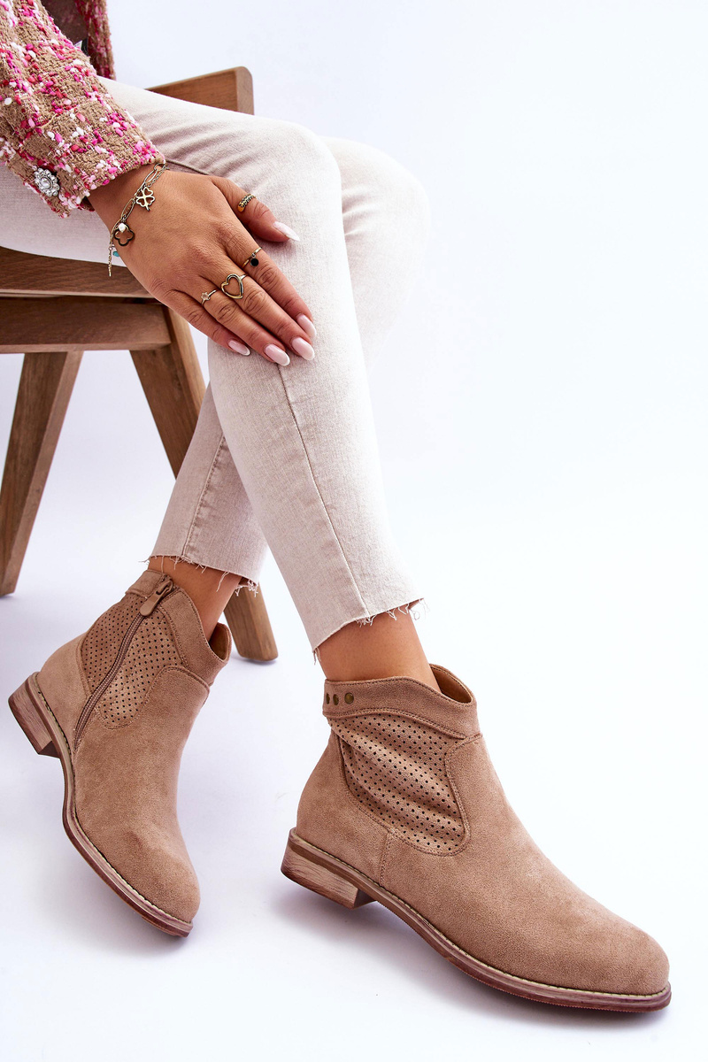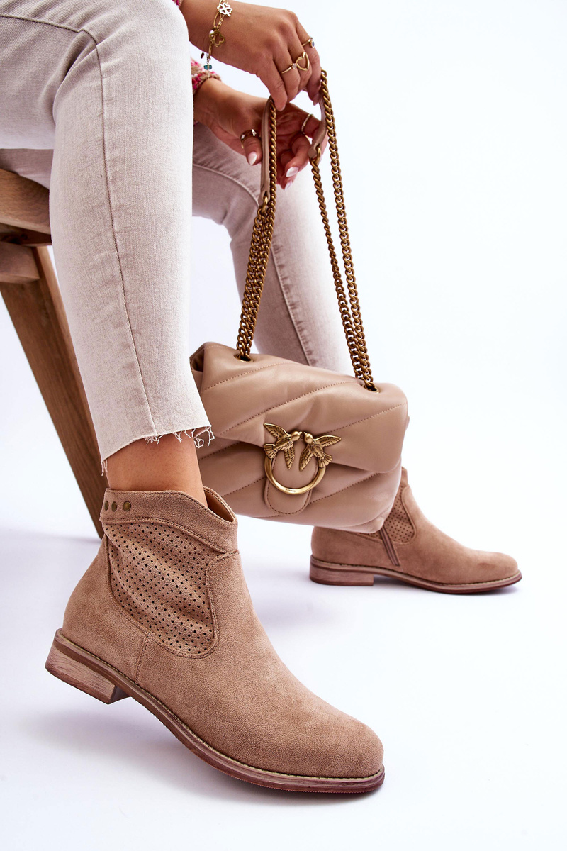 Класичні черевики з приємної на дотик еко замші з ажурним верхом. Мають декоративні елементи у вигляді шпильок. Комплект на плоскій каблуці. Крім того, черевики мають посилений каблук. Збоку на верху є бігунок для зручного взування. Обов’язково ознайомтеся з іншими моделями чобіт у нашій пропозиції! Обираючи розмір, орієнтуйтеся на таблицю розмірів.