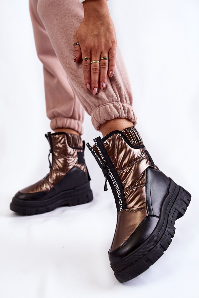 Модні жіночі снігові черевики виготовлені з матеріалів, стійких до вітру та морозу. Спереду вони застібаються на блискавку. Ці ботильйони мають прошиту верхню частину з рантом у верхній частині. М'який утеплювач у вигляді хутра захистить від холоду. Снігові черевики кріпилися на плоскій каблуці і платформі. При виборі розміру скористайтеся таблицею розмірів.