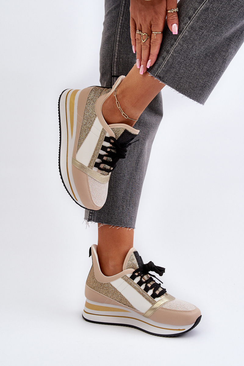 Жіночі кросівки на танкетці з платформою та парчовим золотим рафані