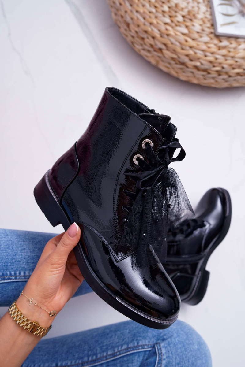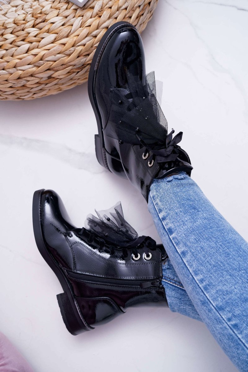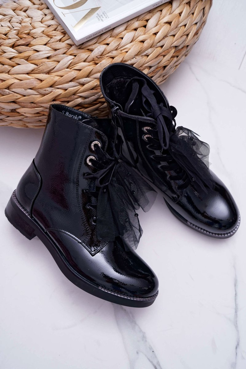 Елегантні черевики від компанії S.BARSKI чорного кольору. Виготовлений з якісної еко - лакованої шкіри. Мають утеплення у вигляді взуттєвої ковдри. Прикраса у вигляді бантика на шнурівці. Під час вибору розміру дотримуйтеся таблиці розмірів.