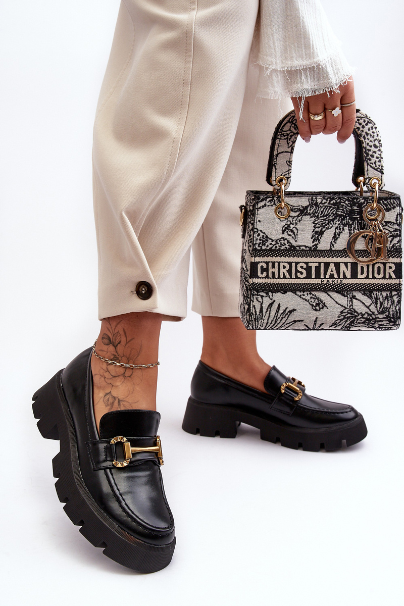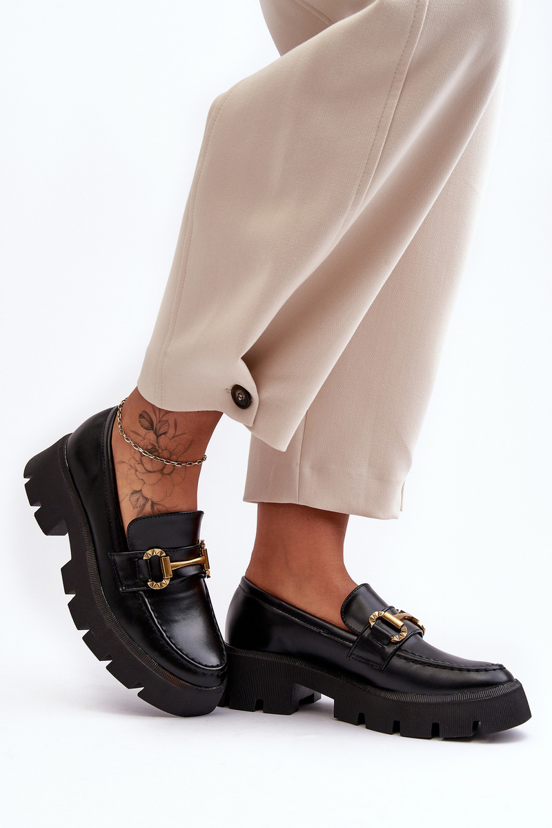 Жіночі півчобітки з еко шкіри. Встановлені на плоский масивний каблук і товсту підошву. Спереду золотий орнамент на ремінці. М'яка устілка з екошкіри забезпечує комфорт під час використання. Вони чудово виглядають як з брюками, так і зі спідницями. Вибираючи розмір, орієнтуйтеся на таблицю розмірів.