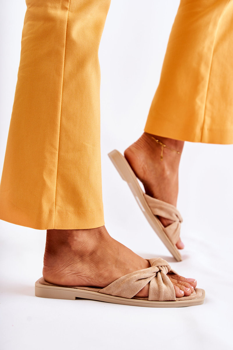 Класичні жіночі тапочки виготовлені з приємної на дотик еко замші. Смуги клапанів з’єднуються спереду, утворюючи вузол. Устілка стьобана також з еко замші. Тапочки на плоскій каблуці. Модель, яка ідеально підійде для повсякденних справ, напр. під час шопінгу чи прогулянки. Ці тапочки мають відкритий квадратний носок. При виборі розміру скористайтеся таблицею розмірів.
