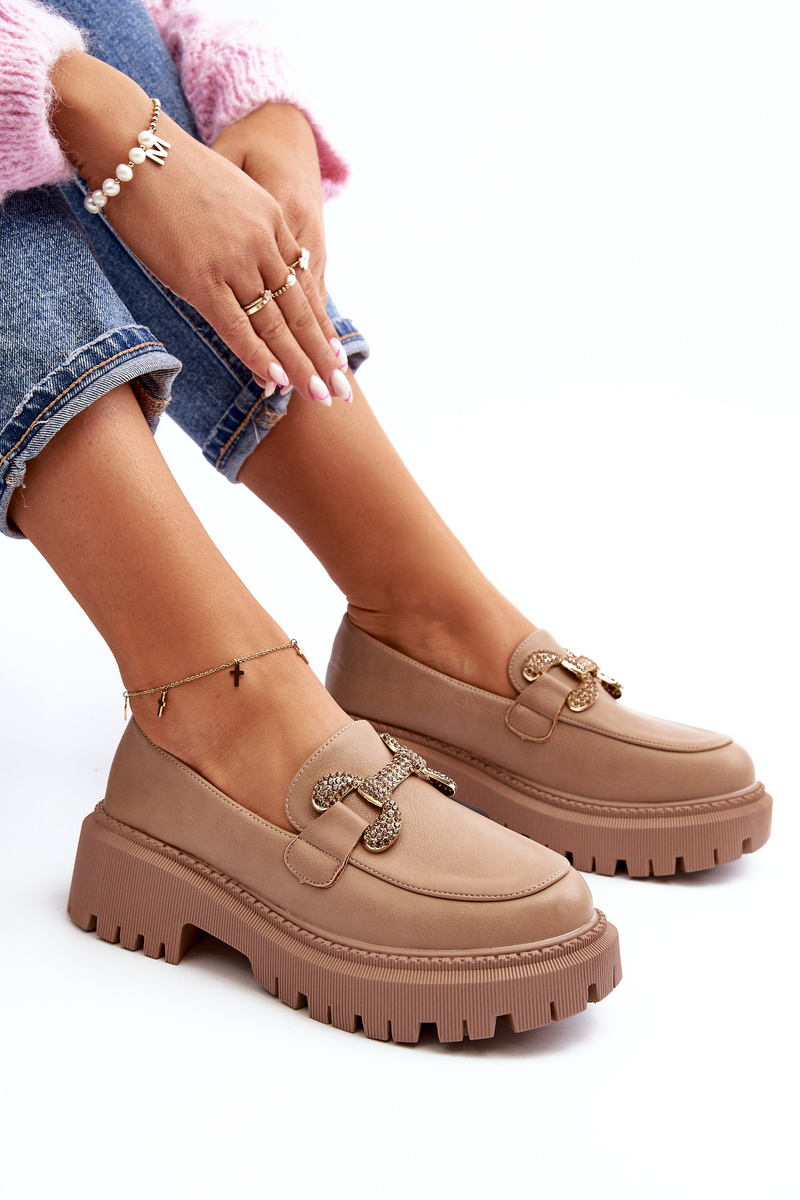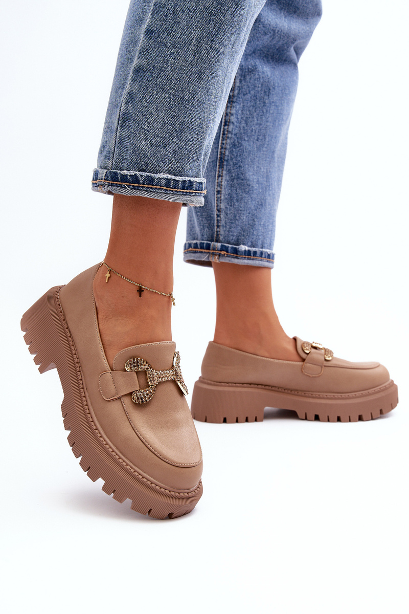 Жіночі мокасини з еко шкіри. Встановлені на масивний плоский каблук і товсту підошву. Ця модель має закруглені носки та золотий декор спереду. Ви обов'язково повинні мати їх у своєму гардеробі! Обираючи розмір, орієнтуйтеся на таблицю розмірів.