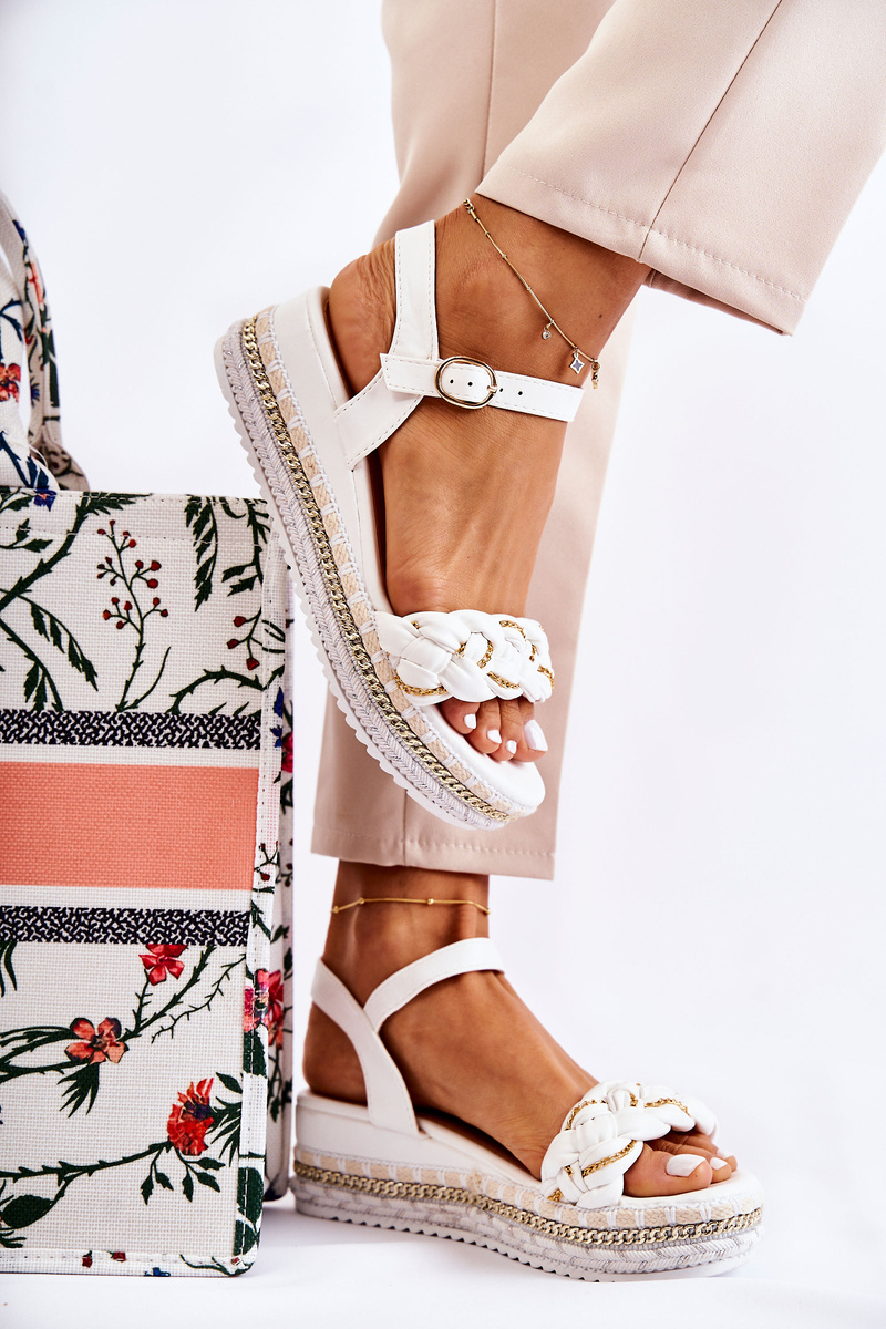 Жіночі босоніжки з еко шкіри. Мають регульований ремінь, який застібається на пряжку. Особливу увагу варто звернути на плетений пояс у вигляді коси з ланцюжком. Босоніжки кріпилися на платформі з низькою танкеткою. Він також був прикрашений ланцюжком і тканинними косами. Підошва виготовлена з пластику. М'яка устілка з екошкіри забезпечує комфорт під час використання. При виборі розміру скористайтеся таблицею розмірів.