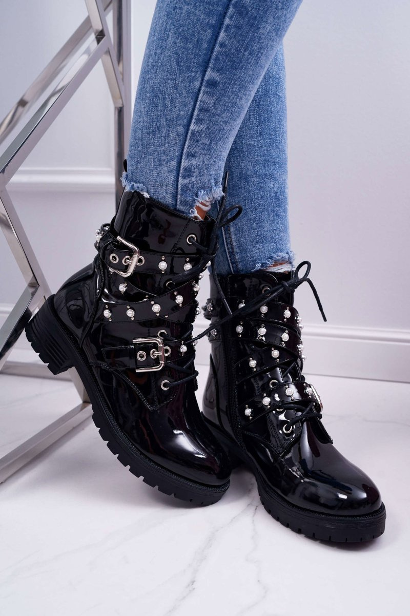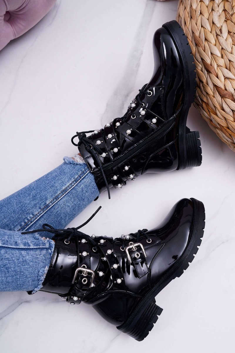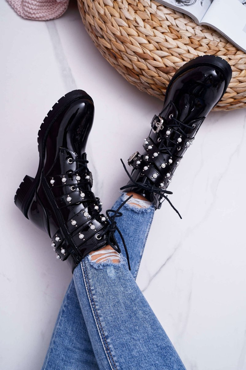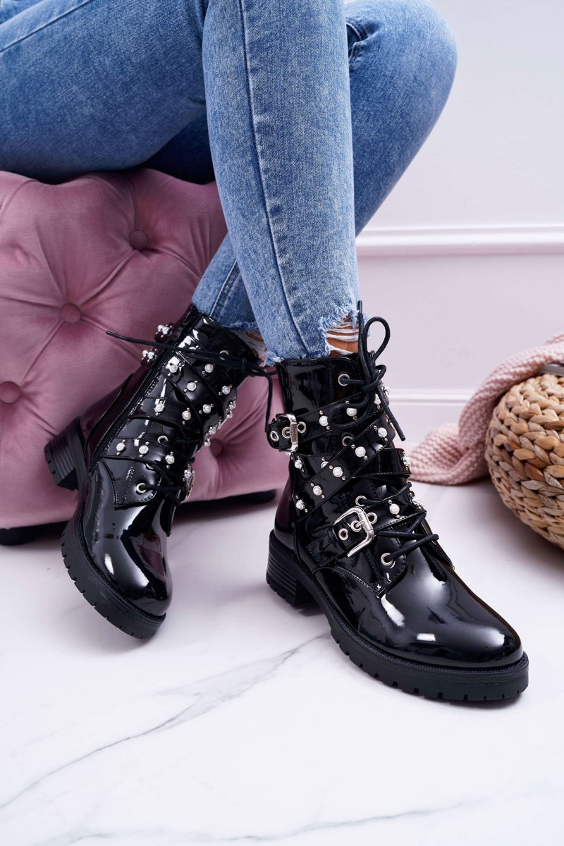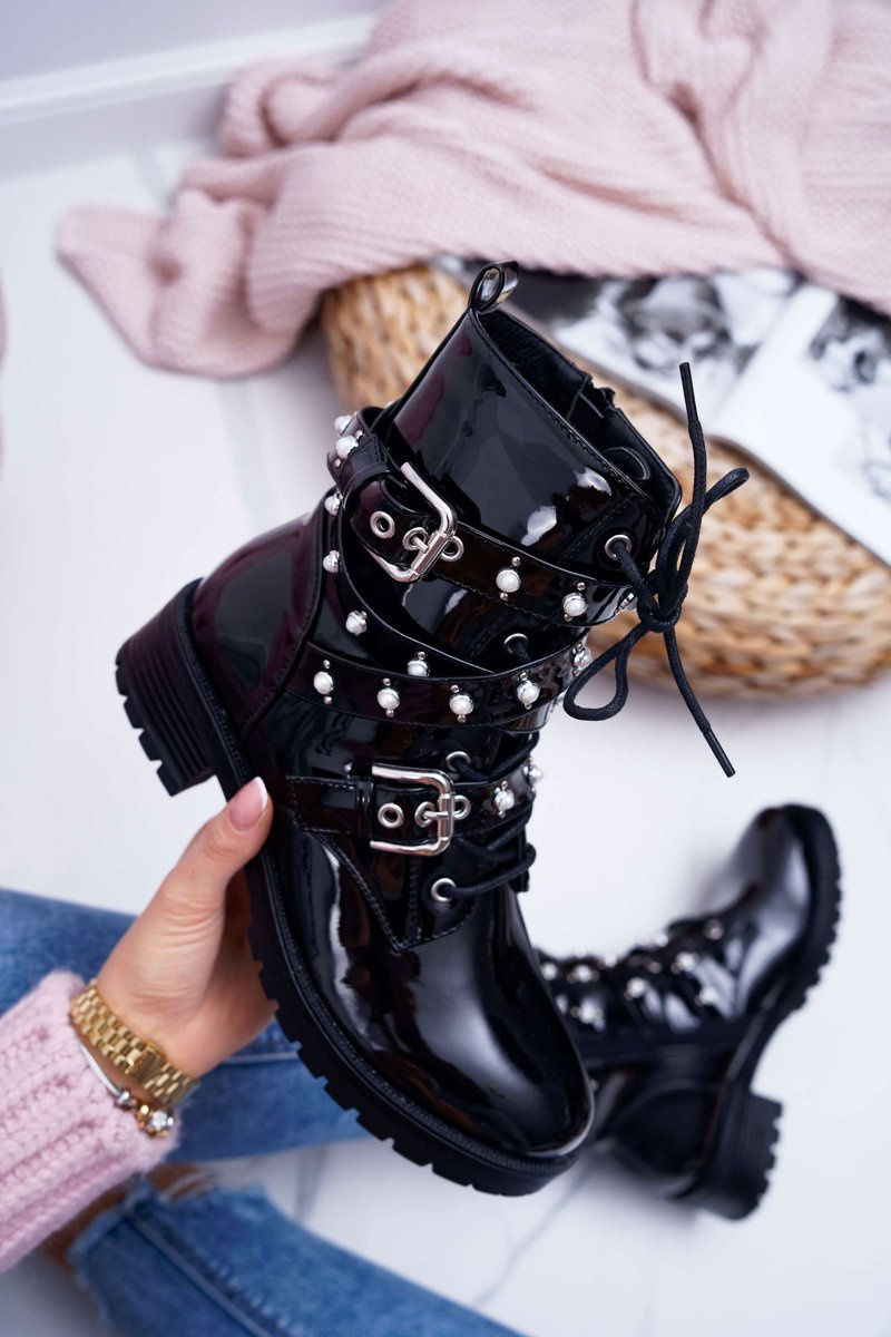 Чорний колір у поєднанні з лакованою екошкірою - хіт! Такі чобітки підходять буквально до будь-якого стилю та випадку. Пряжки і перли - чудова прикраса, від якої неможливо відірвати погляд. Внутрішня частина - приємна на дотик ковдра для взуття з коротким ворсом, тому холодні дні не будуть для нас проблемою. Застібка-блискавка збоку полегшить надягання. Під час вибору розміру дотримуйтеся таблиці розмірів.