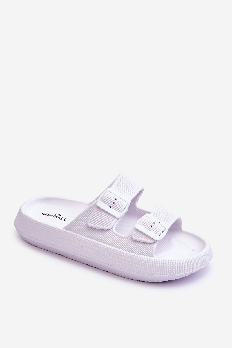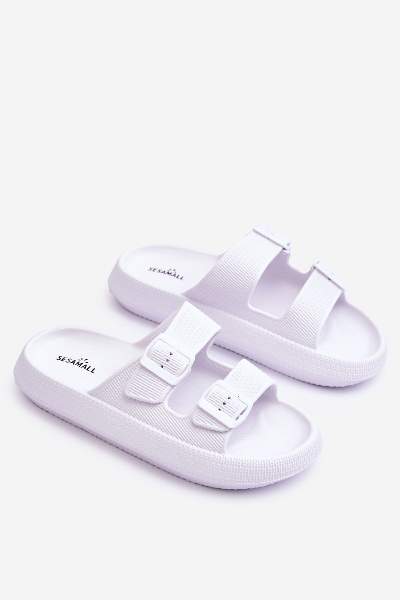 Класичні жіночі тапочки виготовлені повністю зі спіненого матеріалу. Вони мають пластикові пряжки з регульованими ремінцями. Ця модель була встановлена на масивній платформі. Ідеальне взуття для літнього сезону. Ці тапочки надзвичайно повітряні та зручні. Вони також чудово підходять для басейну чи пляжу. Обираючи розмір, орієнтуйтеся на таблицю розмірів.