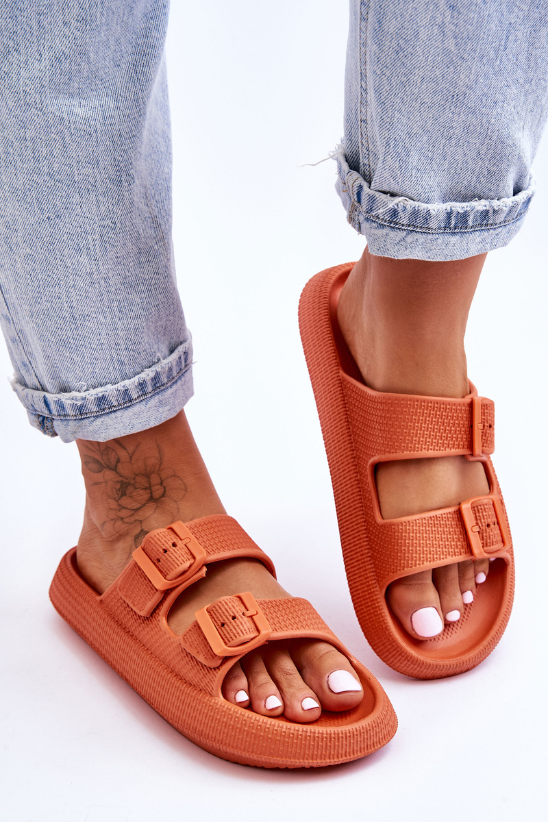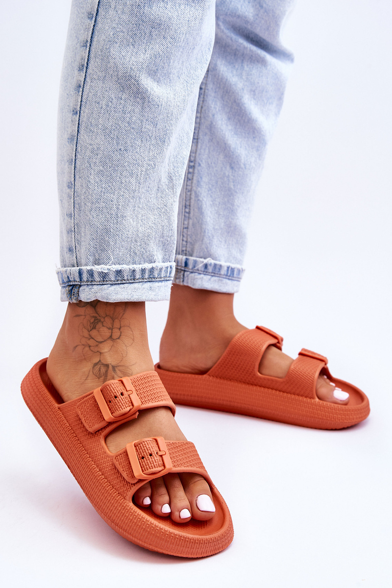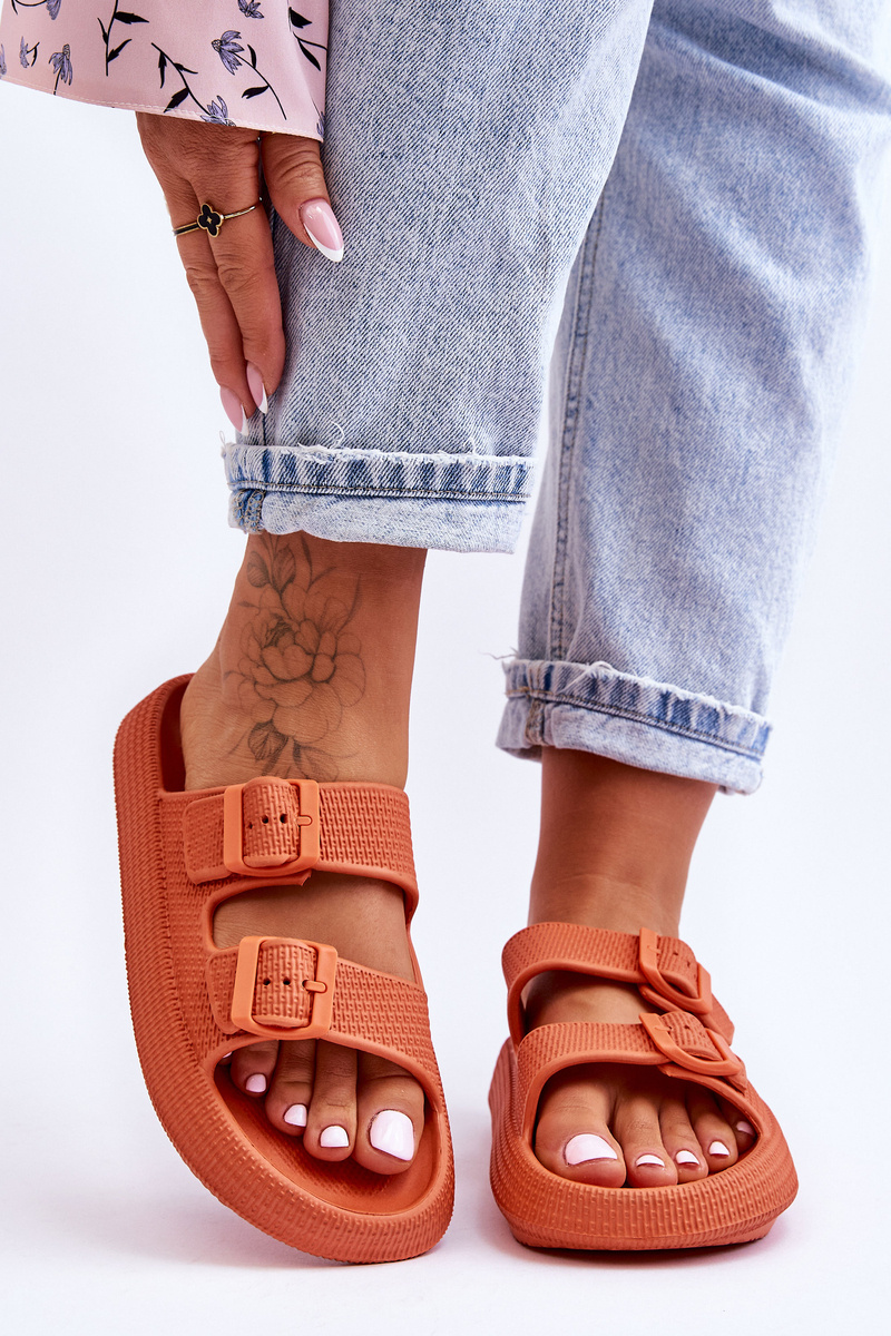 Класичні жіночі тапочки виготовлені повністю зі спіненого матеріалу. Вони мають пластикові пряжки з регульованими ремінцями. Ця модель була встановлена ​​на масивній платформі. Ідеальне взуття для літнього сезону. Ці тапочки надзвичайно повітряні та зручні. Вони також чудово підходять для басейну чи пляжу. Обираючи розмір, орієнтуйтеся на таблицю розмірів.