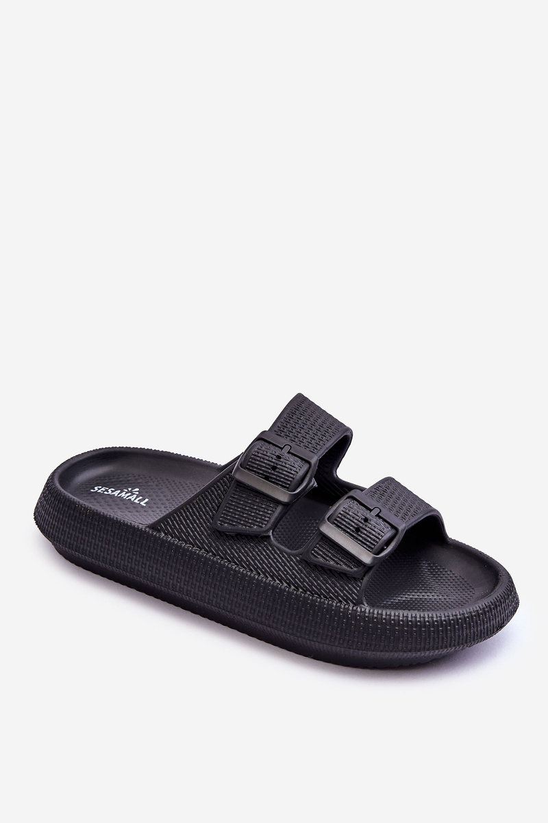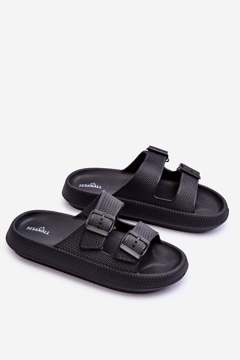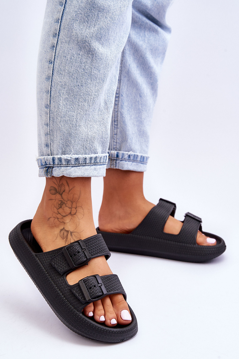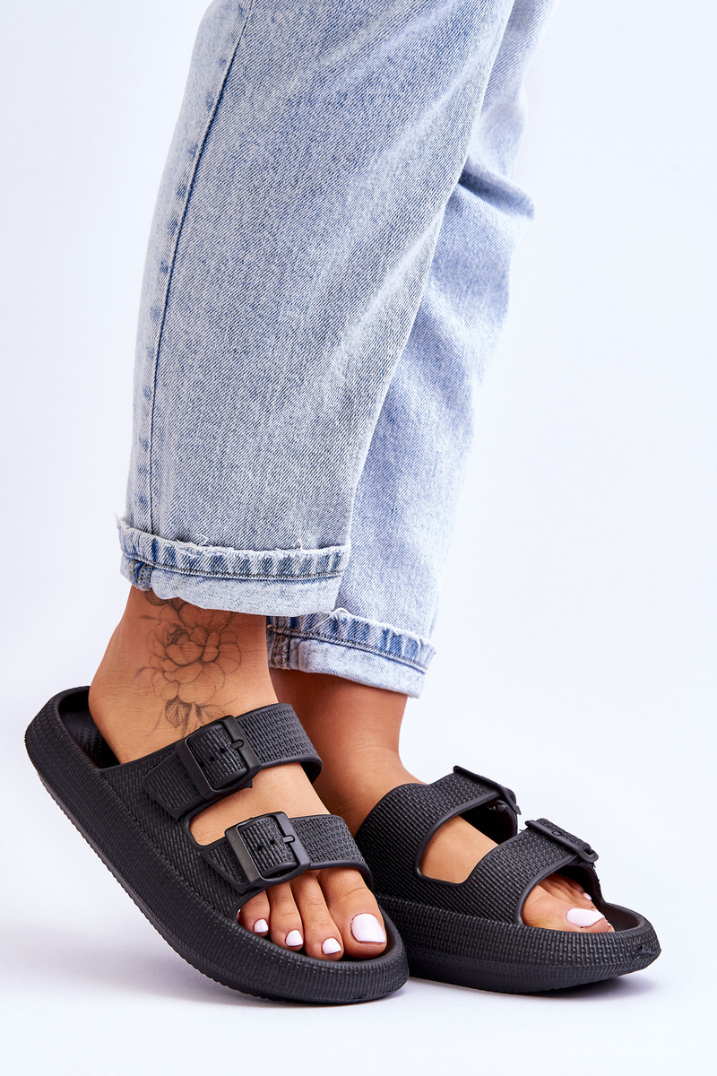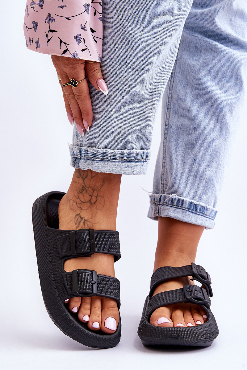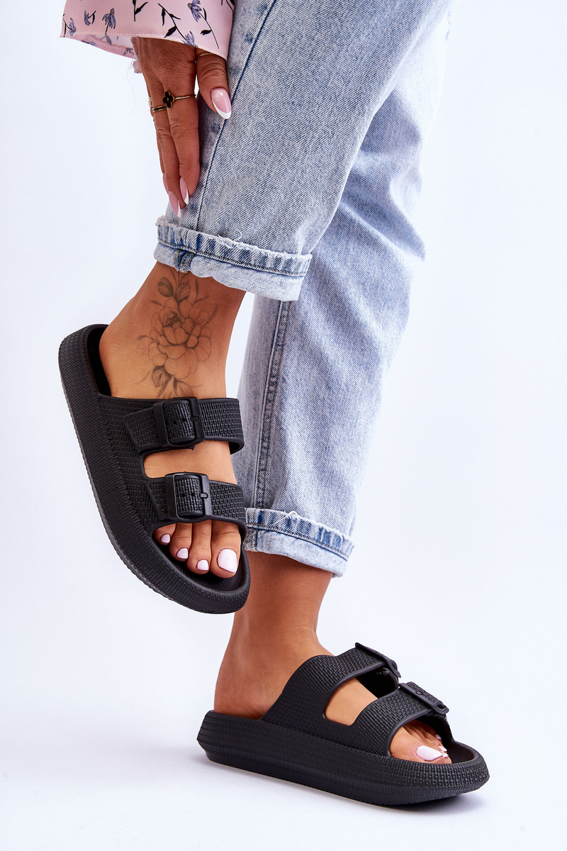 Класичні жіночі тапочки виготовлені повністю зі спіненого матеріалу. Вони мають пластикові пряжки з регульованими ремінцями. Ця модель була встановлена на масивній платформі. Ідеальне взуття для літнього сезону. Ці тапочки надзвичайно повітряні та зручні. Вони також чудово підходять для басейну чи пляжу. Обираючи розмір, орієнтуйтеся на таблицю розмірів.