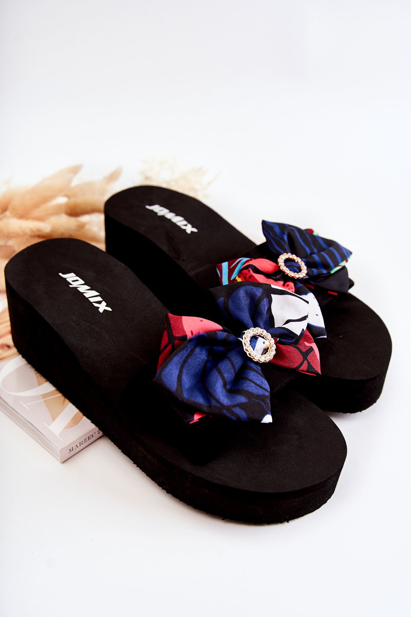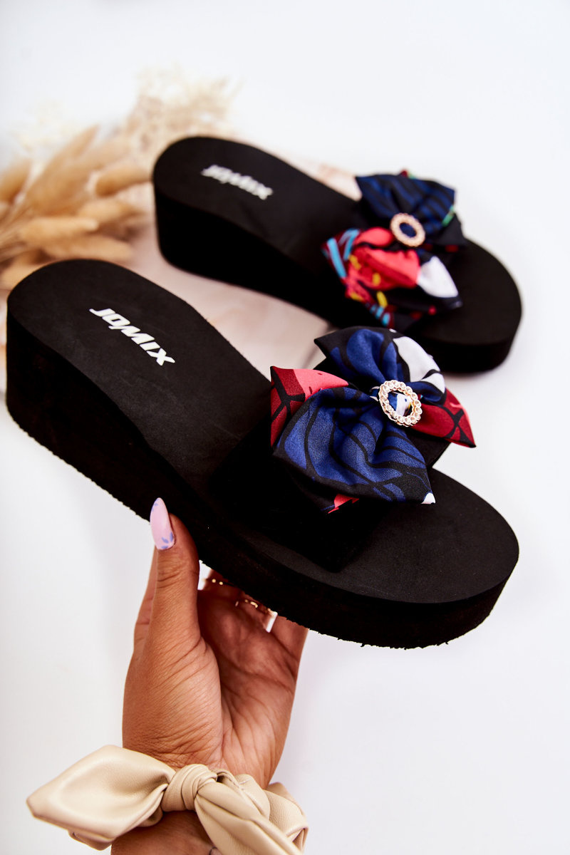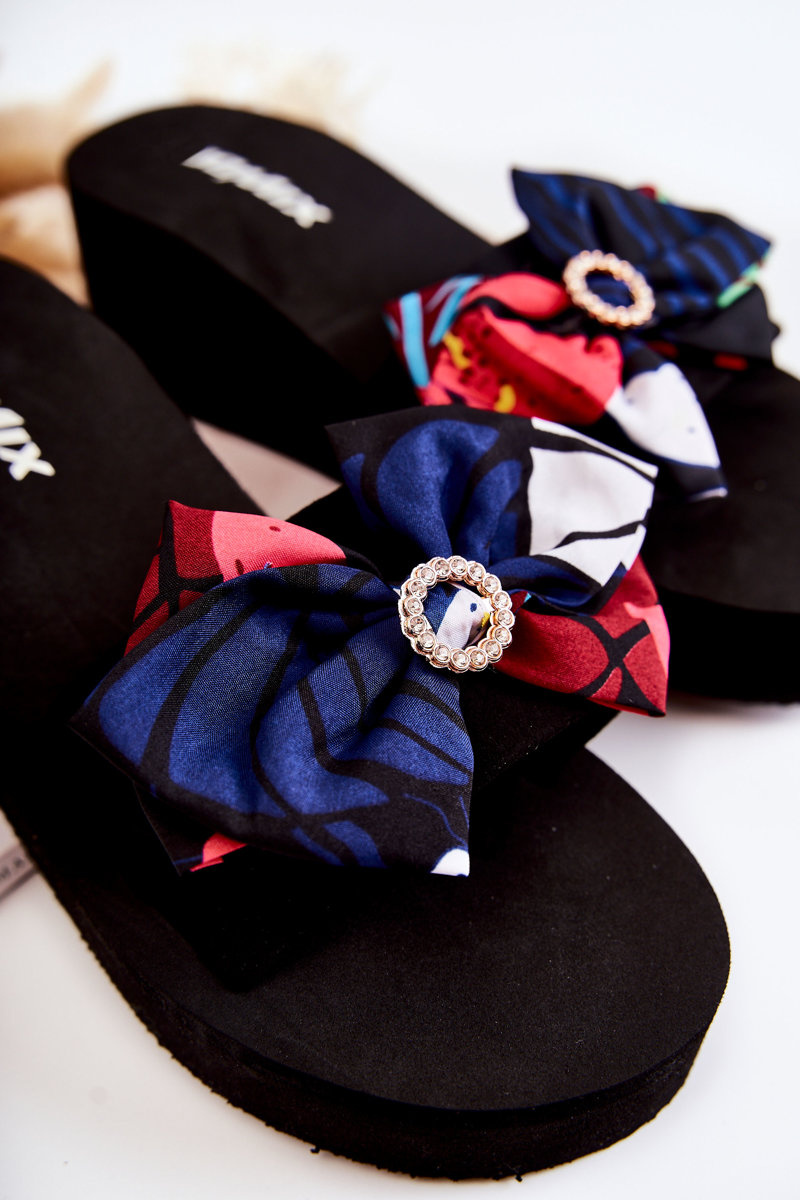 Класичні жіночі тапочки на танкетці і платформі. Пояс з бантом з текстильного матеріалу. Підошва і танкетка виготовлені зі спіненого матеріалу. Дизайн, який неодмінно сподобається багатьом любителям модного натхнення! Бантик декорований пластиковим елементом зі стразами, що імітують стрази. При виборі розміру скористайтеся таблицею розмірів.