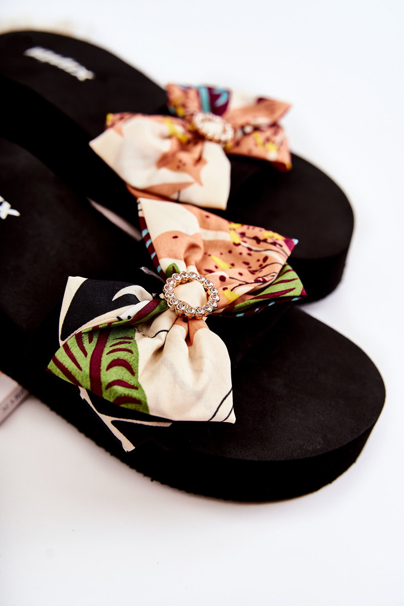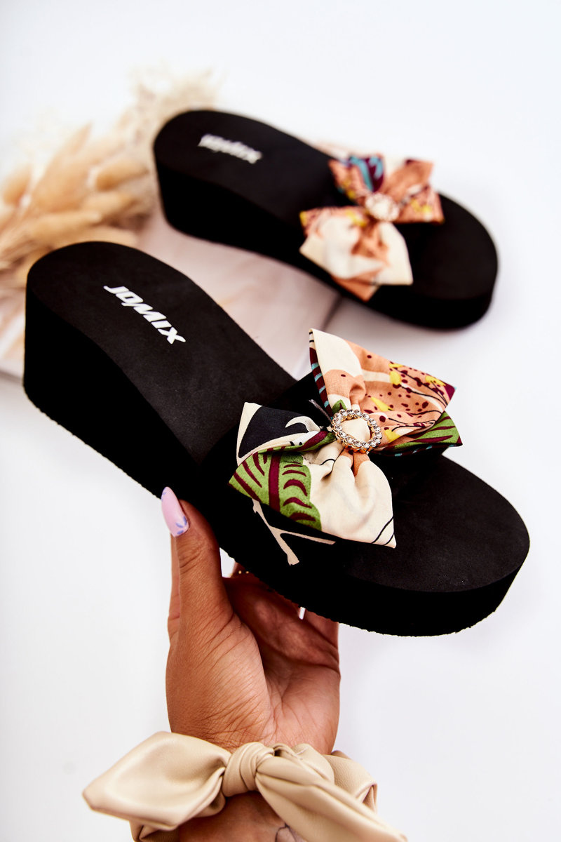 Класичні жіночі тапочки на танкетці і платформі. Пояс з бантом з текстильного матеріалу. Підошва і танкетка виготовлені зі спіненого матеріалу. Дизайн, який неодмінно сподобається багатьом любителям модного натхнення! Бантик декорований пластиковим елементом зі стразами, що імітують стрази. При виборі розміру скористайтеся таблицею розмірів.