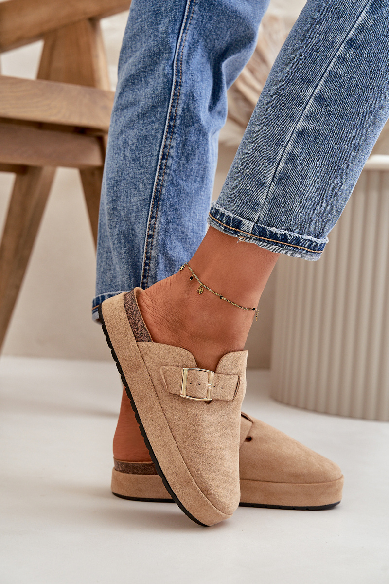 Towar wprowadzony przed 13.12.2024Tak Жіночі сабо на платформі із золотою пряжкою темно-бежеві Terilaina