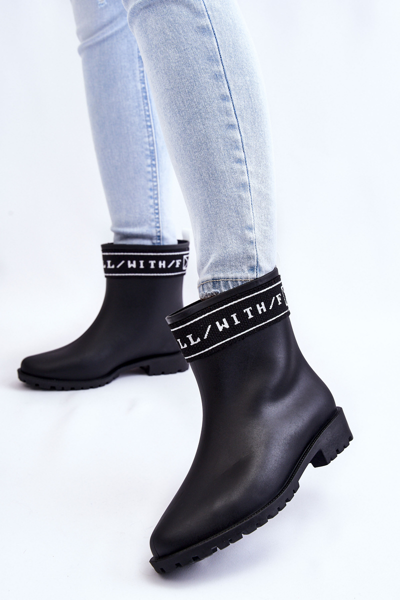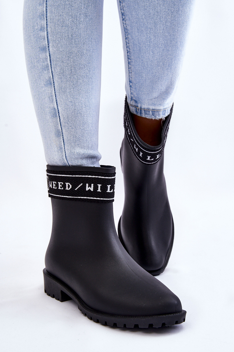 Велінгтони класичні жіночі виготовлені з гумового матеріалу. Дана модель була прикрашена смугою з написом у верхній частині верху. Знімна устілка виконана з тканини. Туфлі встановлені на гумовій підошві з плоскою п'ятою. Крім того, ззаду є ботівстрап, тобто петля, яка полегшує одягання та знімання взуття. Вибираючи розмір, зверніться до таблиці розмірів.