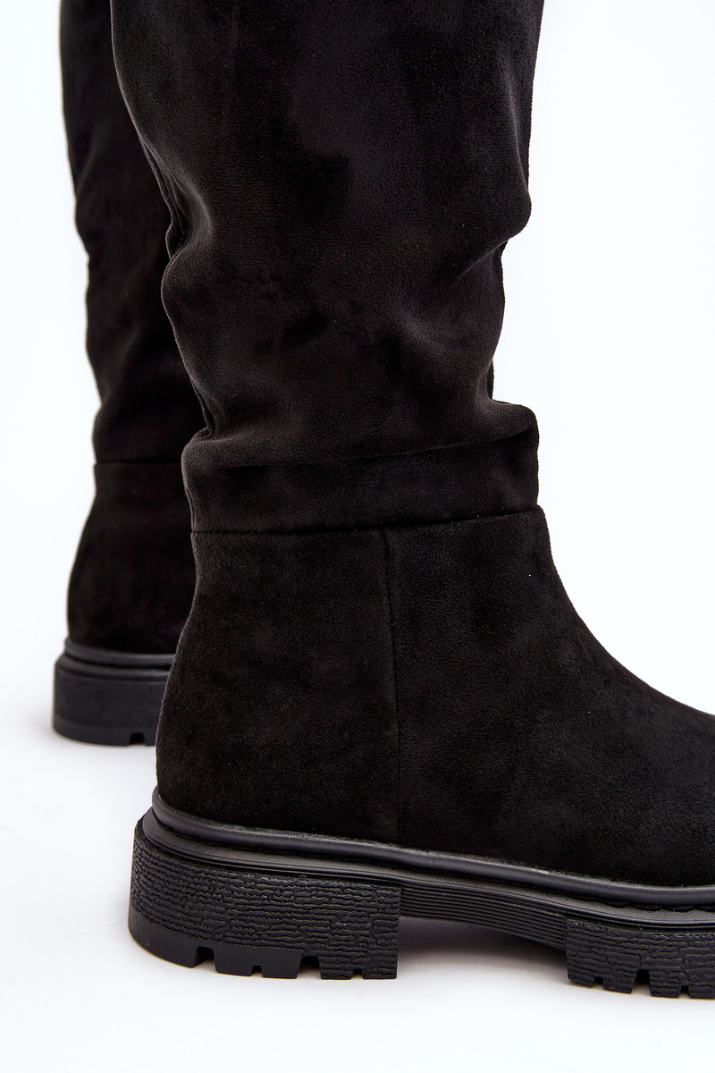 Жіночі черевики виготовлені з еко замші. Комплект на плоскій каблуці. Верх перед коліном. Круглі пальці. Утеплений підкладкою зсередини. Класичний крій підійде для багатьох осінньо-зимових образів! При виборі розміру орієнтуйтеся на таблицю розмірів.