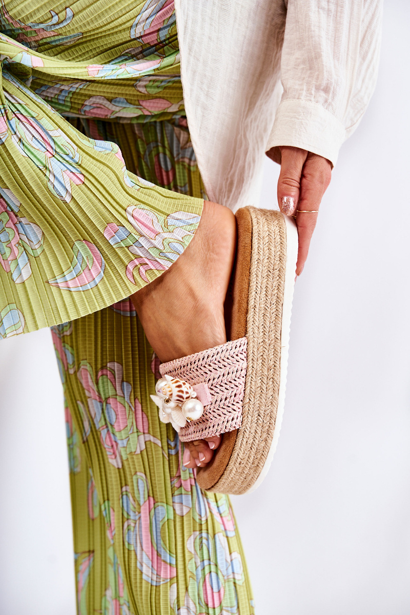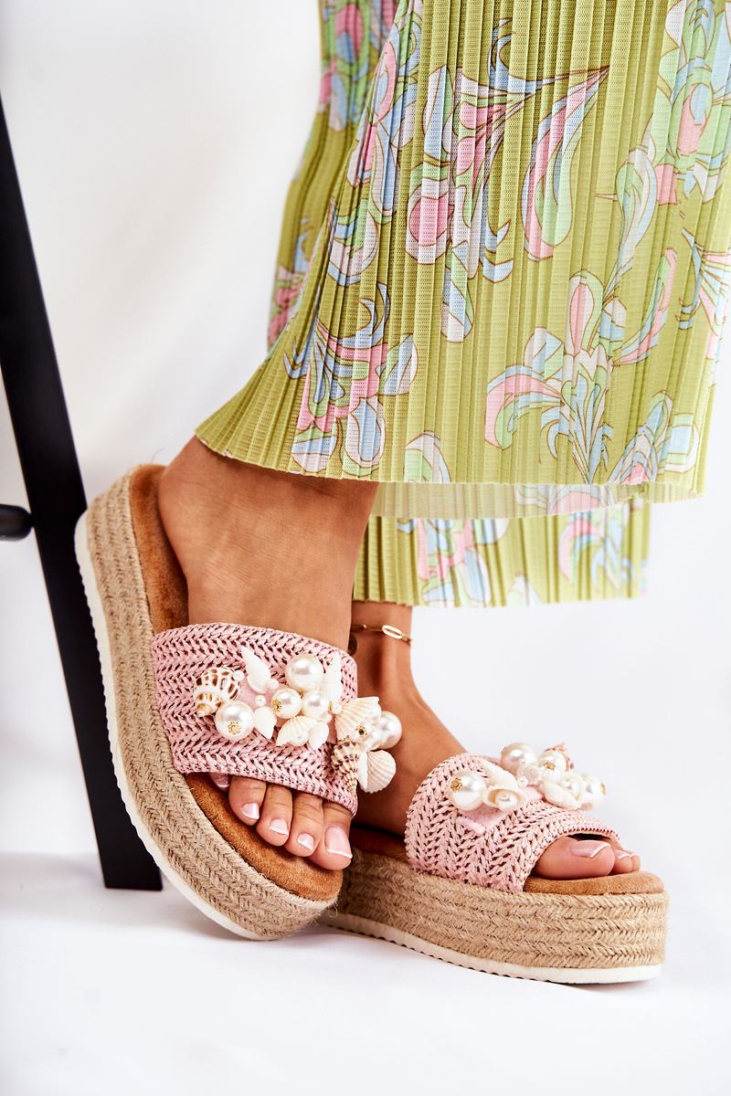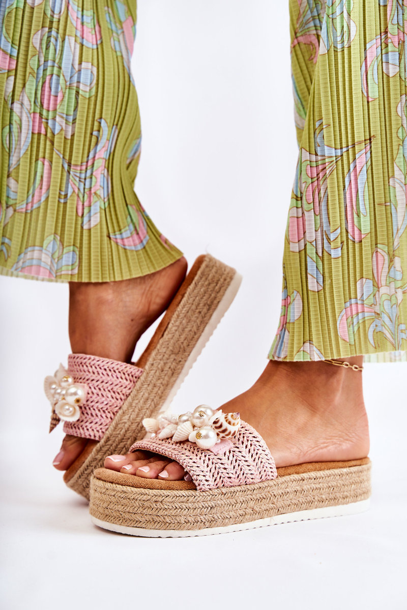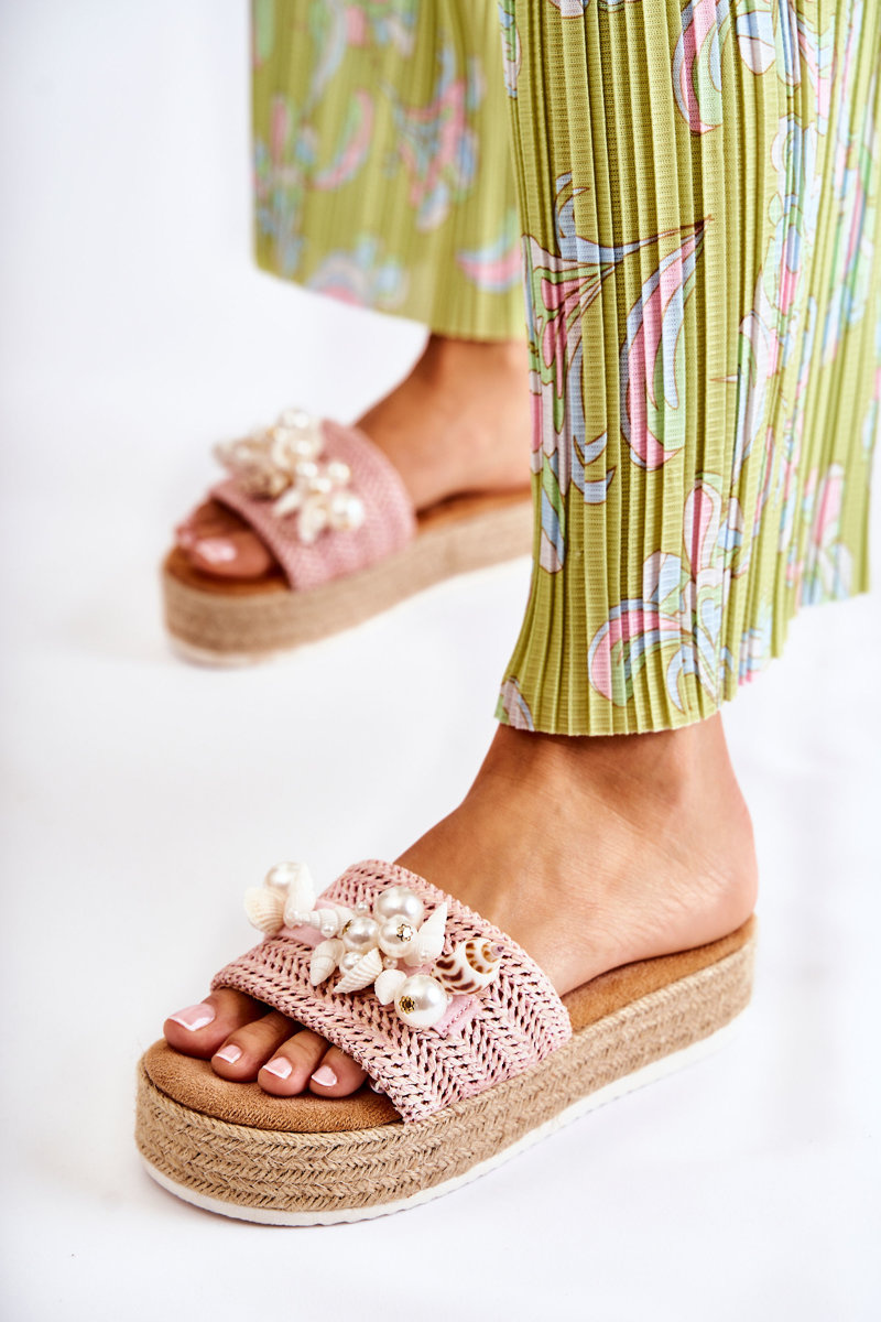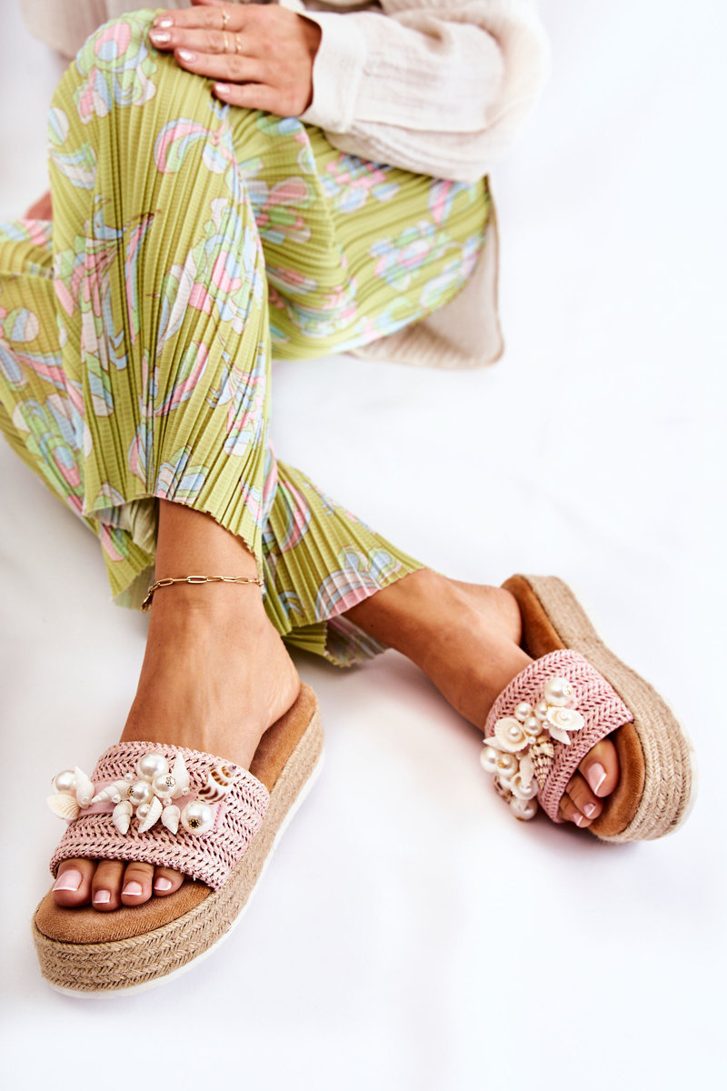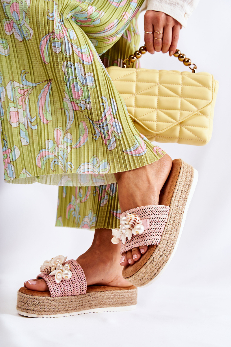 Модні жіночі тапочки ідеальні для спекотних днів! Класична модель сліпони. Вони кріпилися на масивній платформі з джутовою обплетенням. Пластикова підошва. Тапочки мають вставку з м'якої еко замші. Ремінець має декор у вигляді черепашок і перлин. Зручні шльопанці ідеально підійдуть для щоденного використання! При виборі розміру скористайтеся таблицею розмірів.