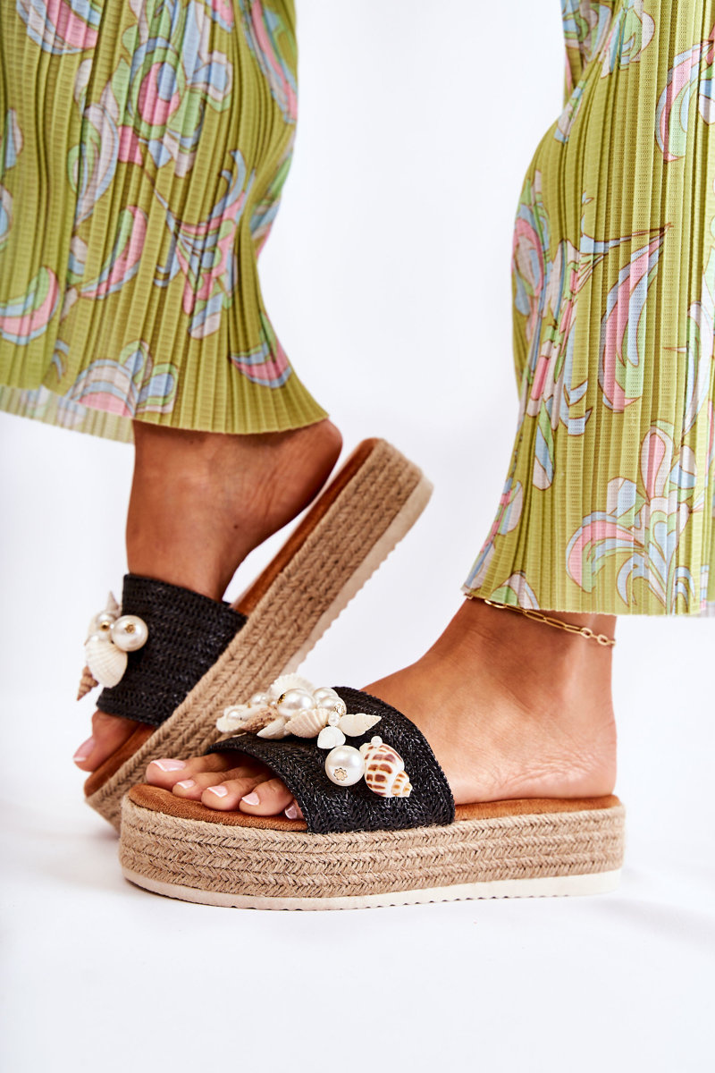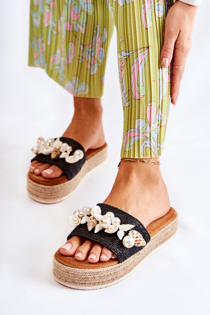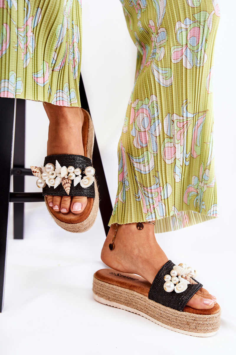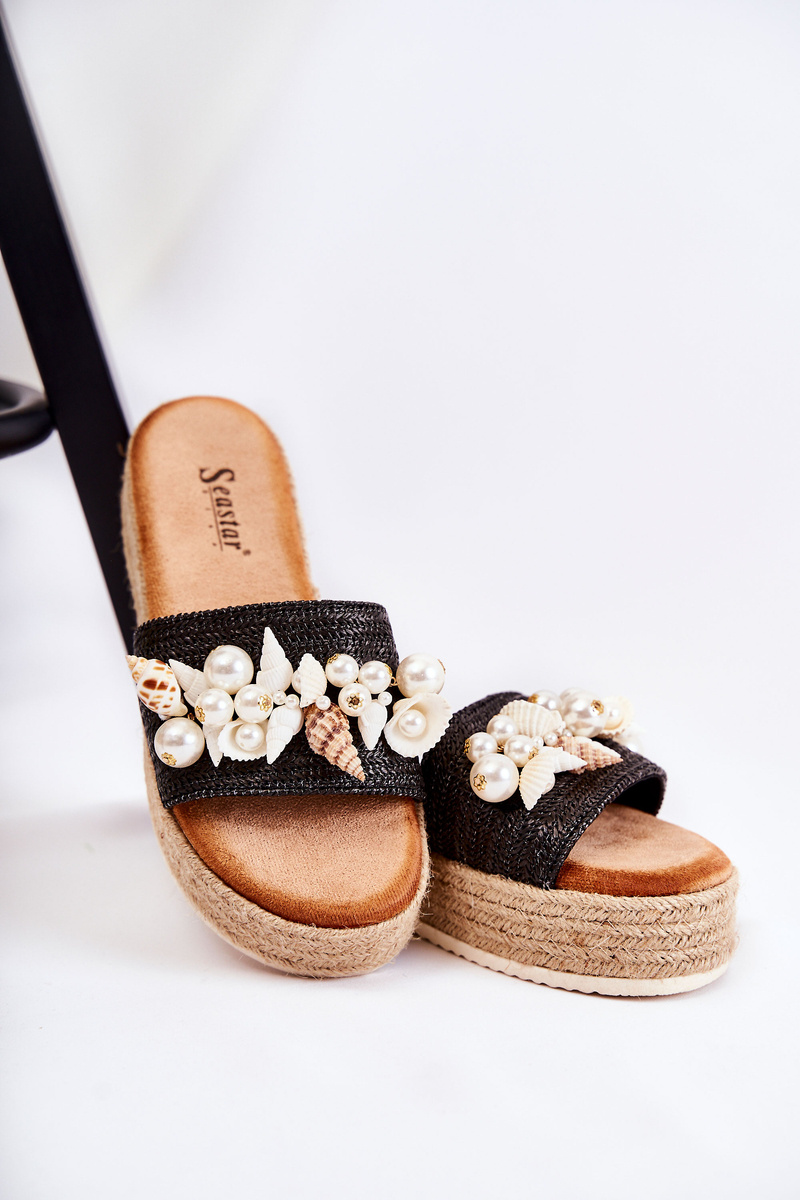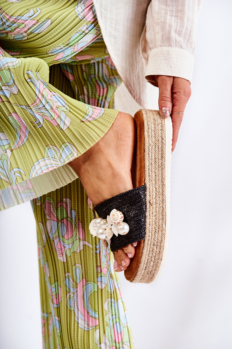 Модні жіночі тапочки ідеальні для спекотних днів! Класична модель сліпони. Вони кріпилися на масивній платформі з джутовою обплетенням. Пластикова підошва. Тапочки мають вставку з м'якої еко замші. Ремінець має декор у вигляді черепашок і перлин. Зручні шльопанці ідеально підійдуть для щоденного використання! При виборі розміру скористайтеся таблицею розмірів.
