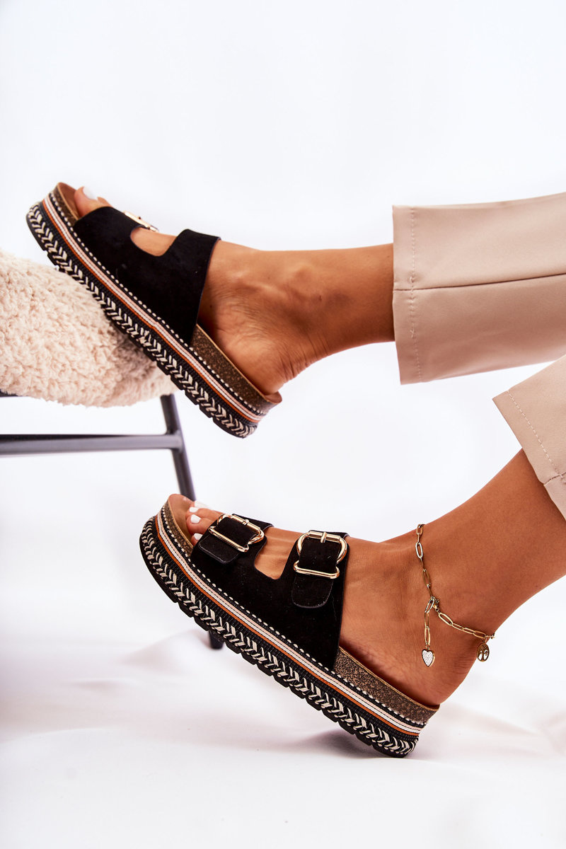 Ідеальні шльопанці для літніх прогулянок і повсякденних походів по магазинах. Ці тапочки мають дві широкі ремінці, які застібаються на пряжку, яку можна регулювати. Зручність і комфорт використання гарантовані, завдяки профільованій устілці з еко-замші. Платформа виготовлена ​​з легкого пластику і додатково декорована тасьмою. У цих тапочках ваші ноги відсвіжаться та відпочивають. При виборі розміру скористайтеся таблицею розмірів.