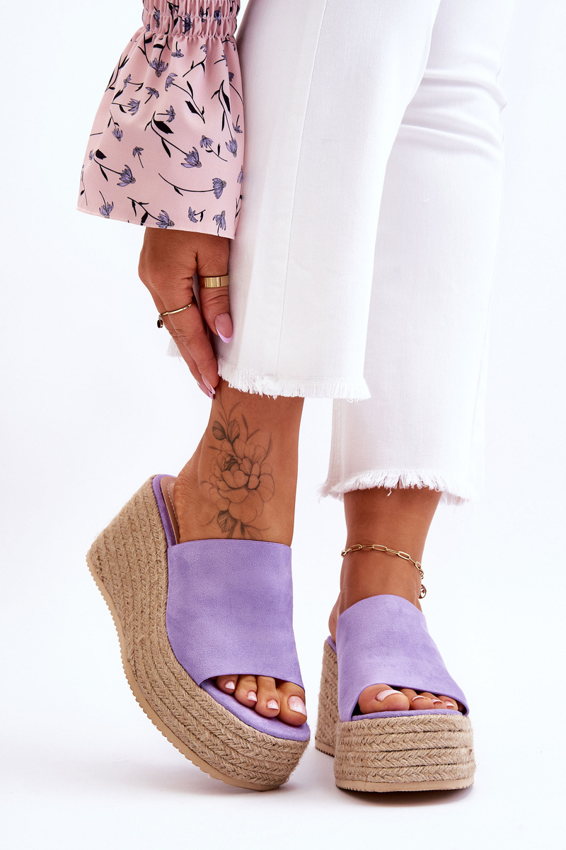 Класичні жіночі шльопанці встановлені на масивній платформі та танкетці, які додатково прикрашені плетеними джутовими косами. Виготовлена ​​з приємної на дотик еко замші. М'яка устілка виконана з еко шкіри. Класична модель, сліпони. Ці шльопанці - чудовий вибір для спекотних літніх днів! Обираючи розмір, орієнтуйтеся на таблицю розмірів.