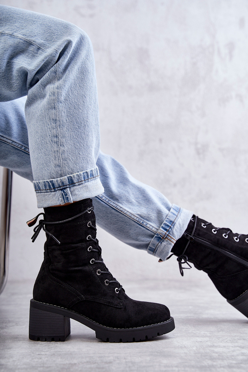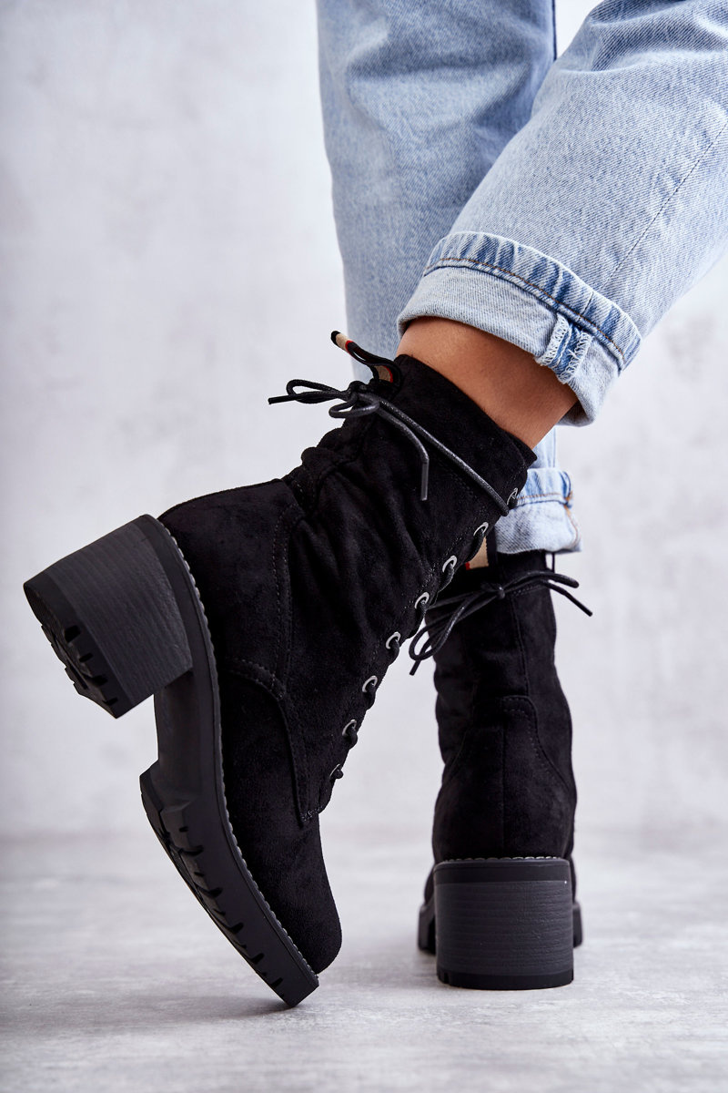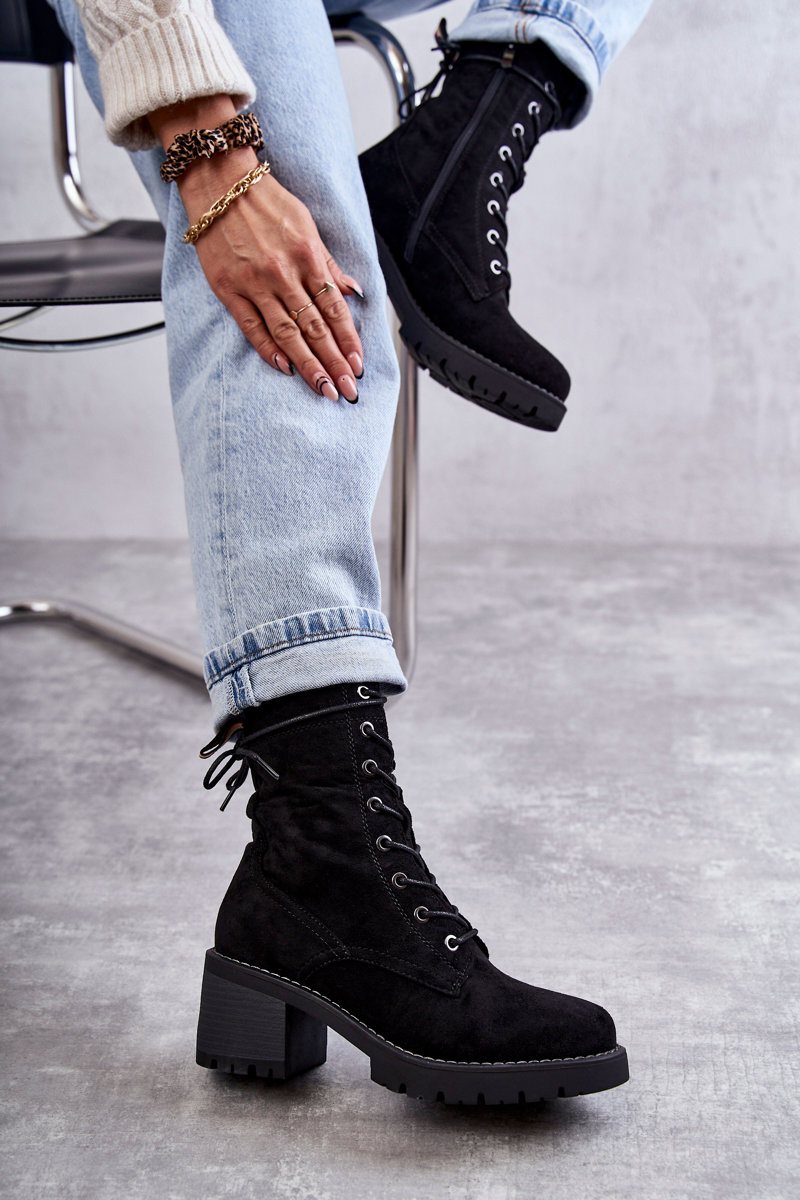 Дана модель виконана з еко замші. Черевики застібаються збоку на блискавку з додатковою шнурівкою. Підошва з гумового матеріалу не ковзає. Черевики кріпляться на каблуці у вигляді масивної стійки і витонченої платформи. Дана модель утеплена ковдрою для взуття. Крім того, п'ятка посилена. При виборі розміру скористайтеся таблицею розмірів.