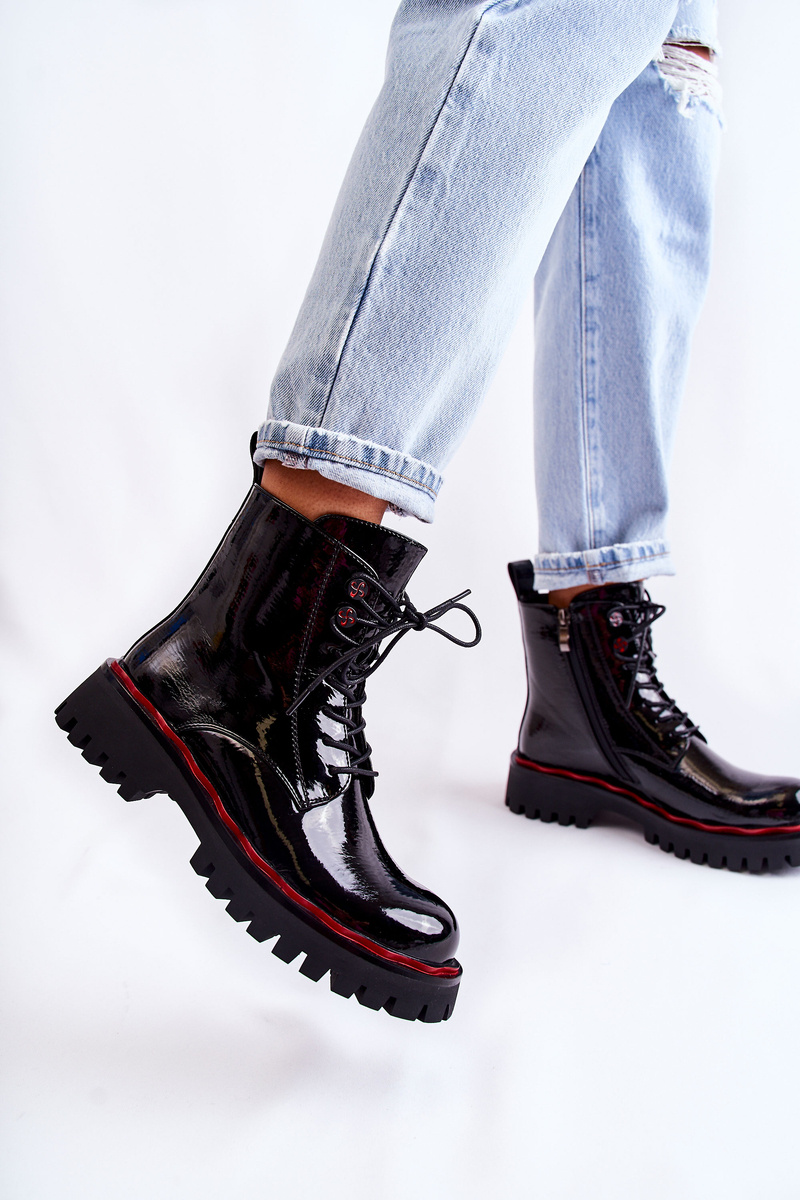 Ці чудові туристичні черевики можуть стати вашими! Виготовлені з лакованої еко шкіри. Мають цікавий малюнок на підошві. Модель на шнурівці, застібається на блискавку. Черевики мають жорсткий каблук. Внутрішня частина та устілка обшиті приємною на дотик ковдрою для взуття. Вони кріпляться на плоскій каблуці і ніжній платформі. Канавки на підошві роблять їх ідеальними для ходьби по нерівній місцевості. При виборі розміру скористайтеся таблицею розмірів.