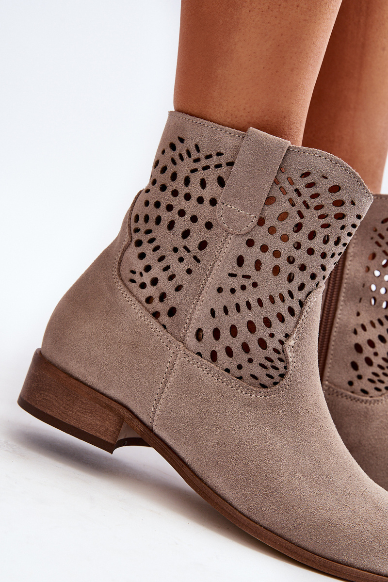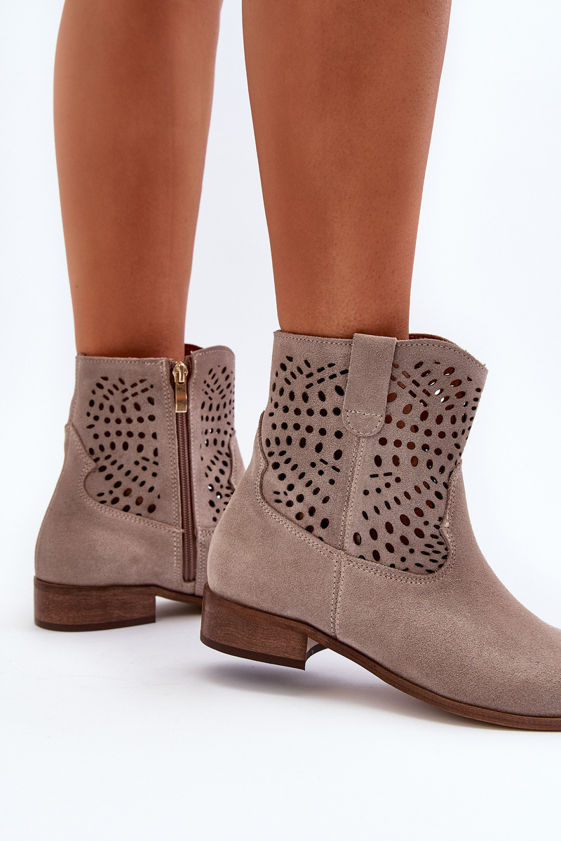 Жіночі ботильйони з мереживним верхом з натуральної замші. На плоскій стійкій каблуці. Заокруглені пальці. Застібається збоку на блискавку. Крім того, ця модель має посилену п'яту. Ідеально підходить для весняних укладок! Обираючи розмір, орієнтуйтеся на таблицю розмірів.