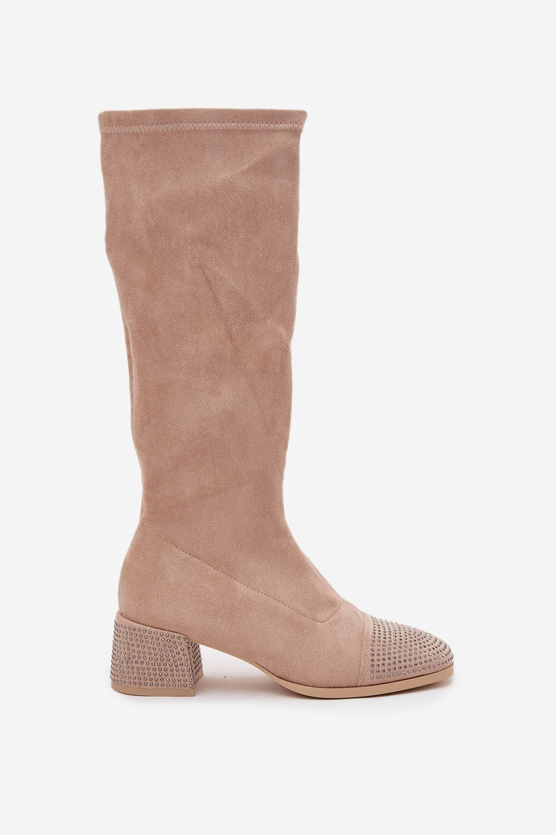 Жіночі чоботи з оздобленням на блоці Еко замш бежевий Ivanna