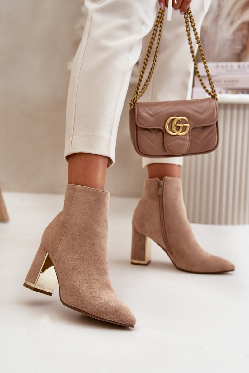 Жіночі ботильйони виготовлені з еко-замші, яка приємна на дотик і надає їм елегантний вигляд. Внутрішня частина чобіт має підкладку, що забезпечує тепло та комфорт у прохолодні дні. Загострені носки надають їм стильного характеру, а каблук у вигляді стійкої колони додатково прикрашений дзеркальним елементом, додаючи чобіткам винятковий блиск і модний акцент. Ви обов'язково повинні мати їх у своєму осінньо-зимовому гардеробі! Обираючи розмір, орієнтуйтеся на таблицю розмірів.