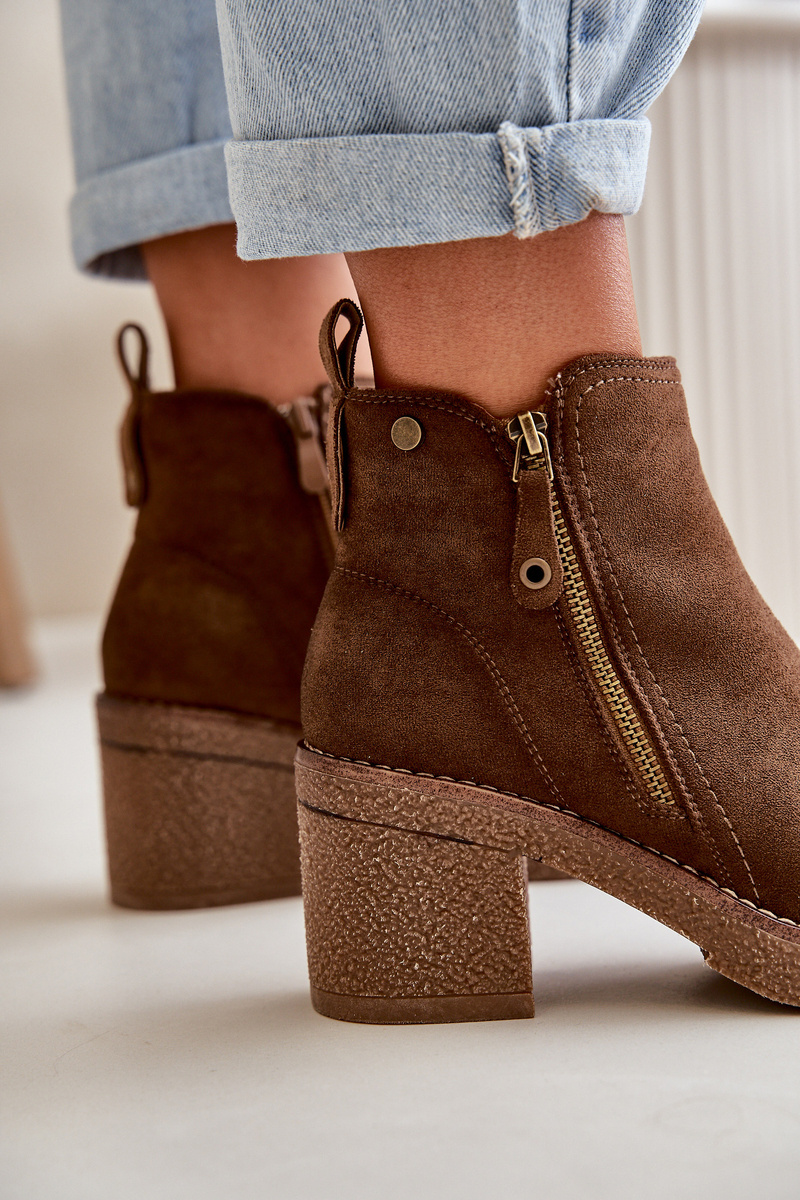 Черевики жіночі з м'якої веганської замші. Встановлюють на стійкий каблук. Внутрішня частина обшита взуттєвим флісом, який забезпечує тепло і комфорт при носінні. Ця модель має закруглені носки і застібається на блискавку, що дозволяє легко одягати і знімати. Ідеально підходить для осінньої та зимової укладки. Обираючи розмір, орієнтуйтеся на таблицю розмірів.