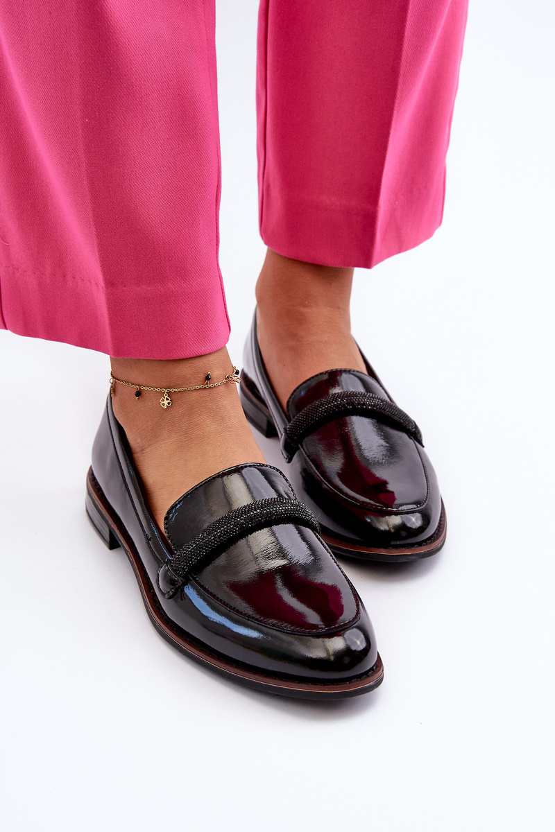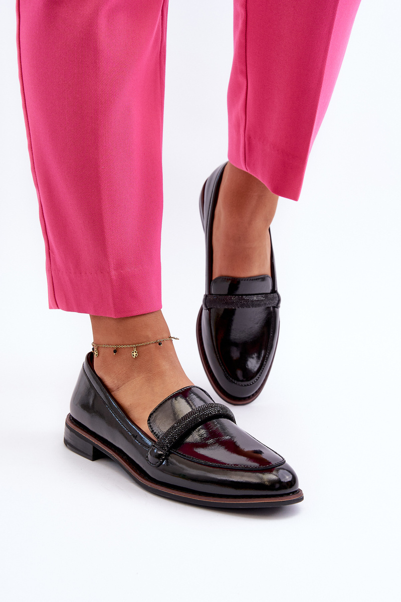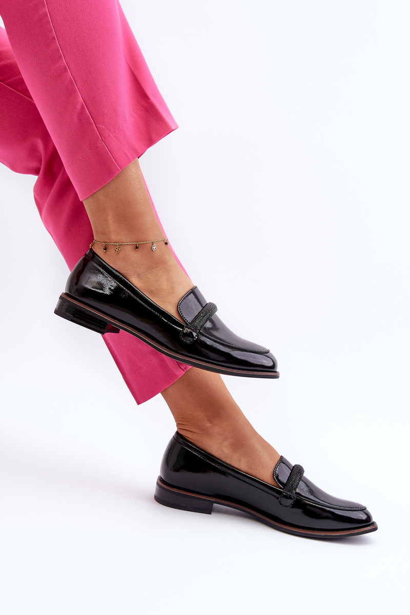 Жіночі чорні лаковані мокасини з декоративним ремінцем Saosin