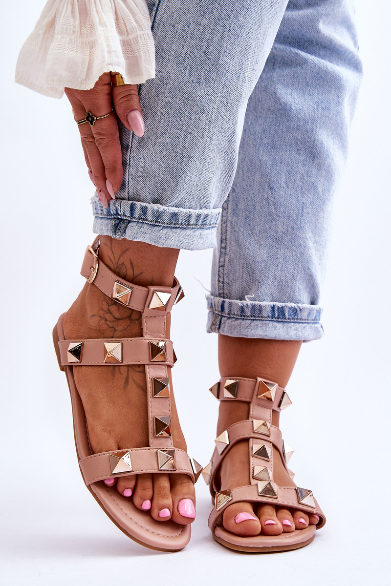 Жіночі босоніжки виготовлені з еко шкіри. Мають застібку у вигляді регульованого ремінця з пряжкою. Крім того, їх прикрашали великі шпильки. Босоніжки мають відкриті пальці і п'яту, що робить їх надзвичайно повітряними. Комплект на плоскій каблуці. Обираючи розмір, орієнтуйтеся на таблицю розмірів.