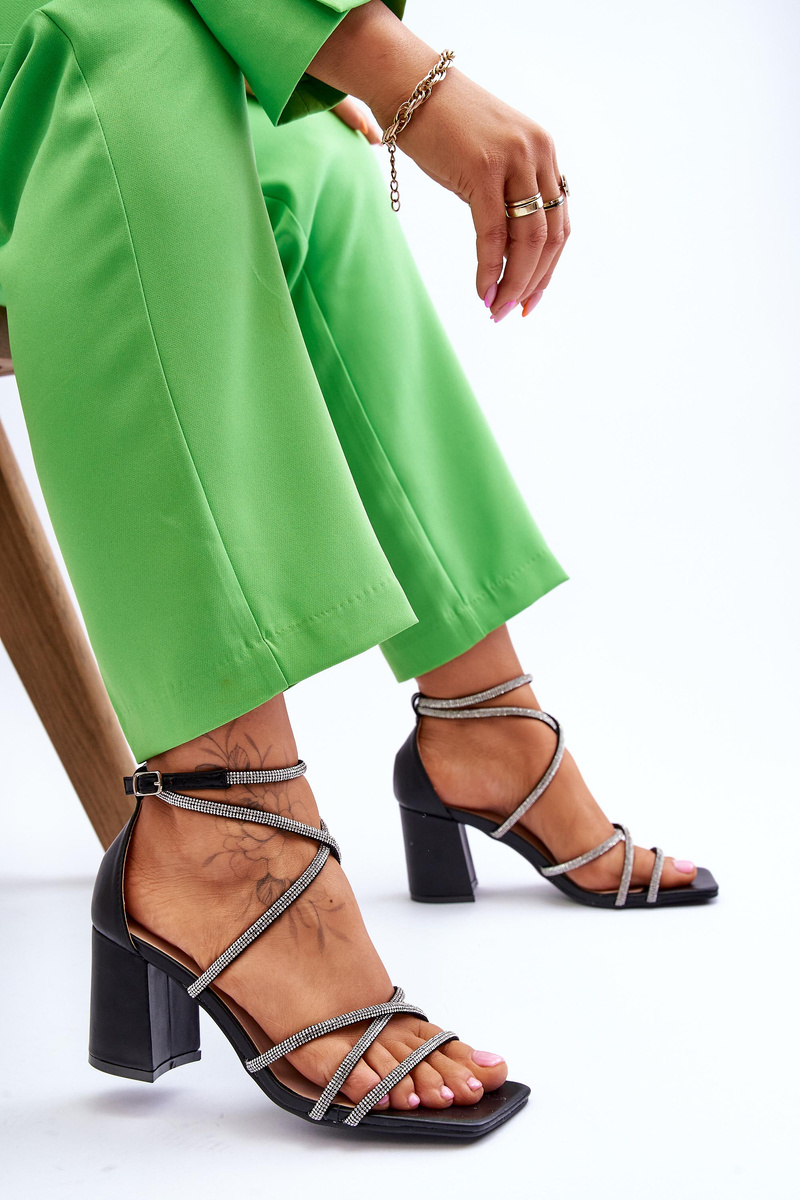Жіночі шкіряні босоніжки на каблуках з цирконієм, чорні Liviano
